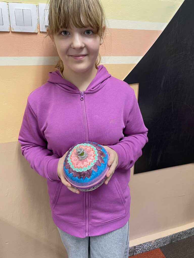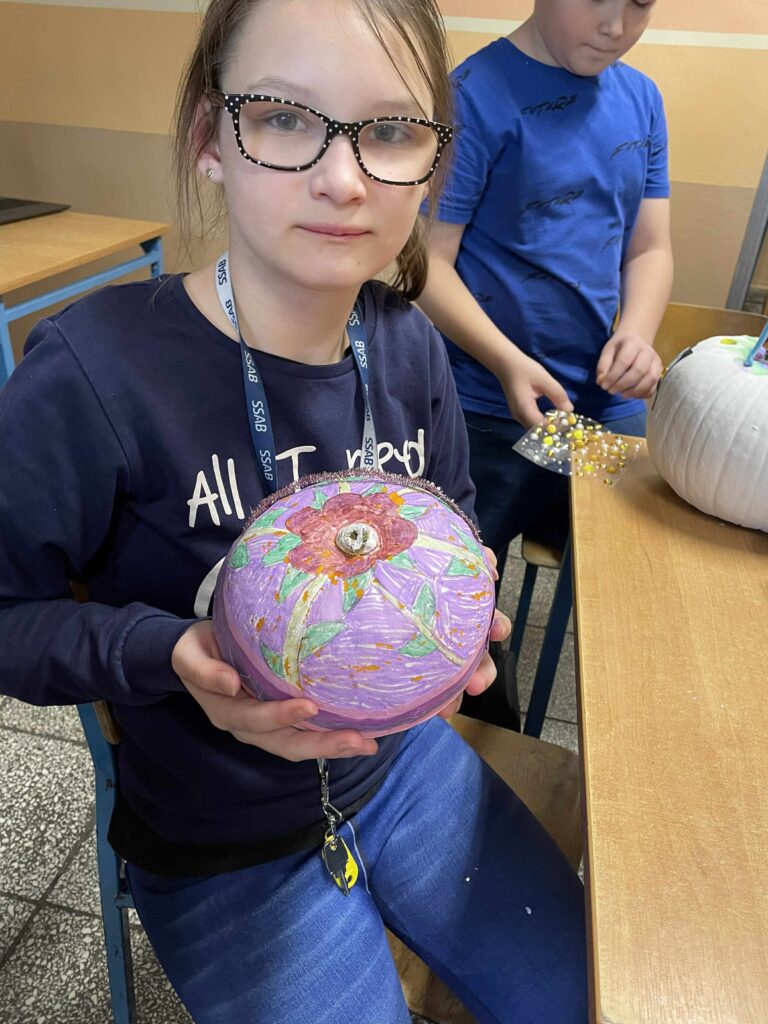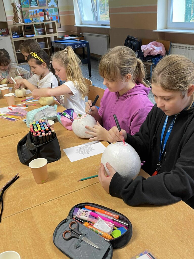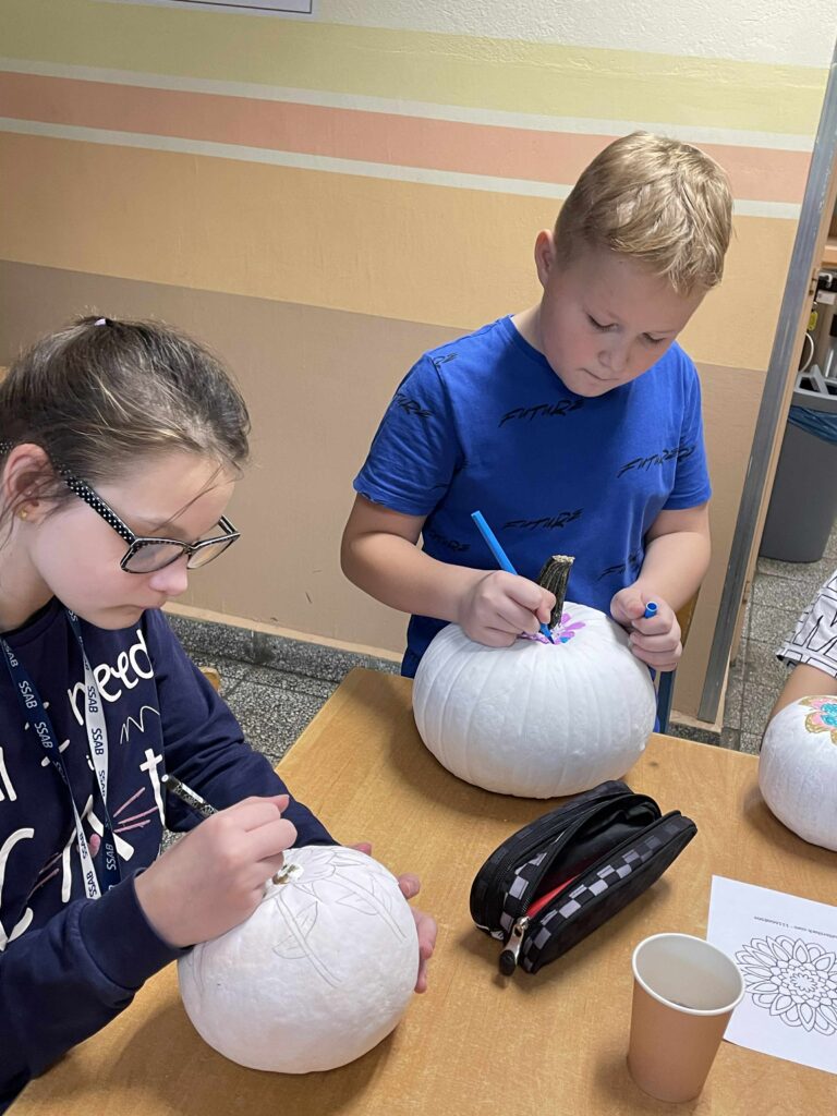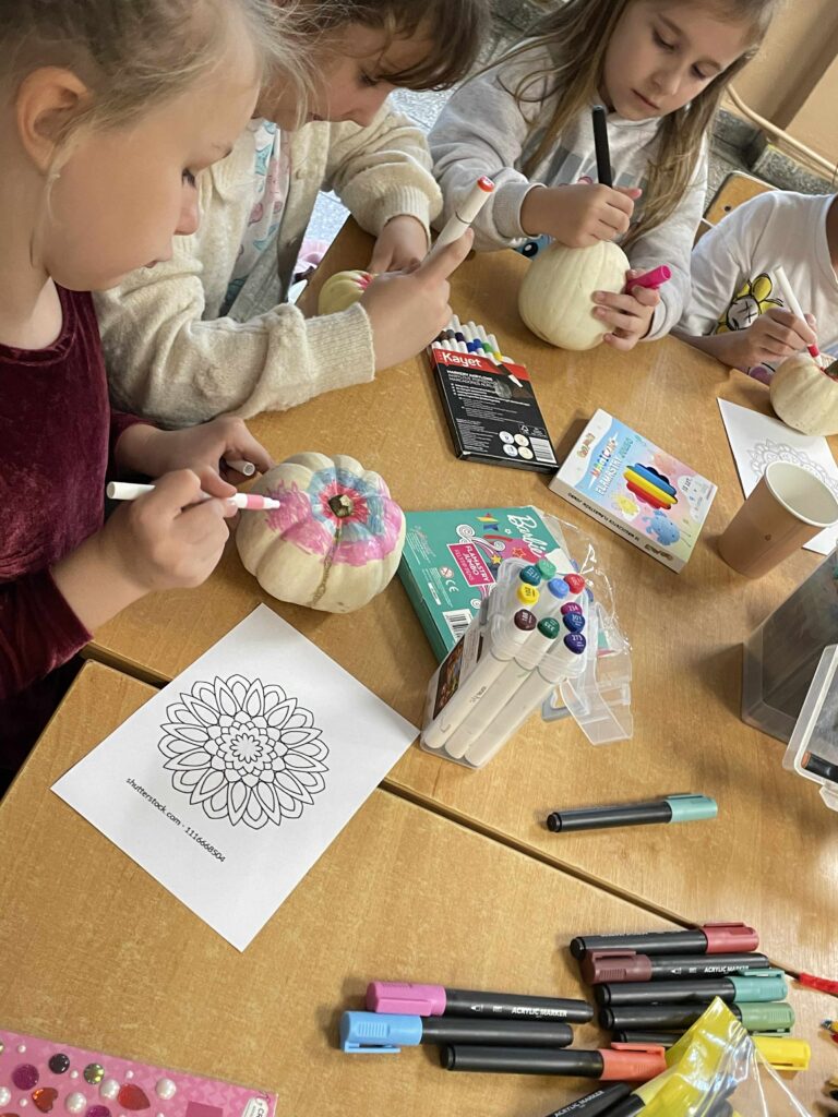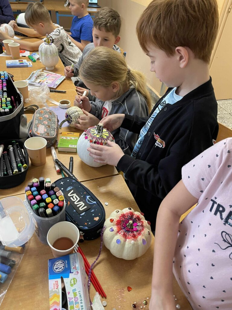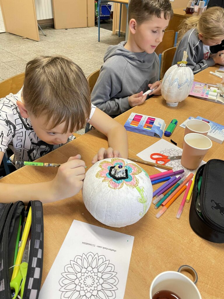 Podczas zajęć uczniowie ozdabiali białe dynie kolorowymi mandalami, skupiając się na kształtach, barwach i własnych emocjach. W tle towarzyszyła im spokojna, relaksacyjna muzyka, a w przerwach mogli rozgrzać się aromatyczną herbatą malinową.