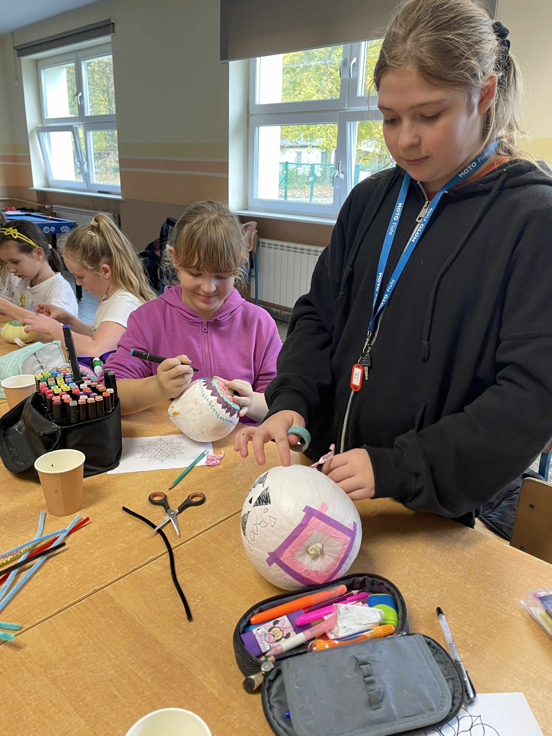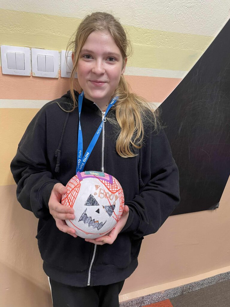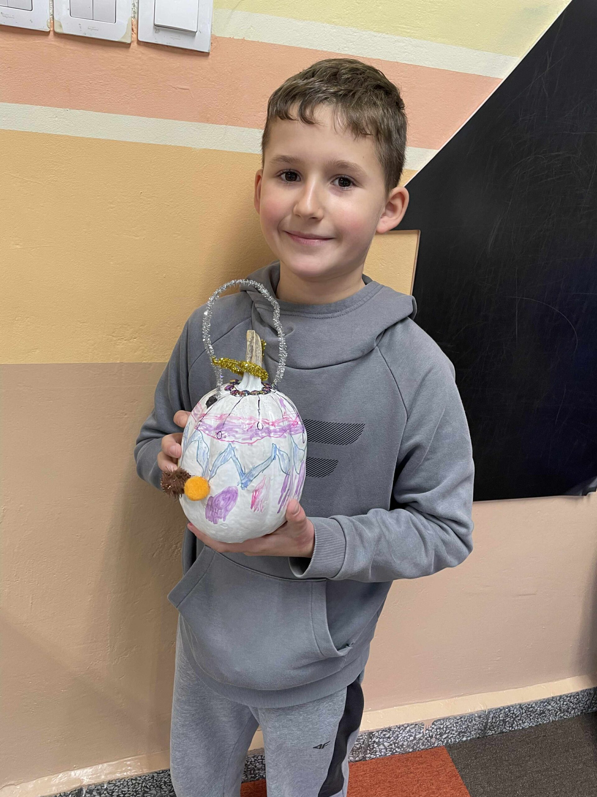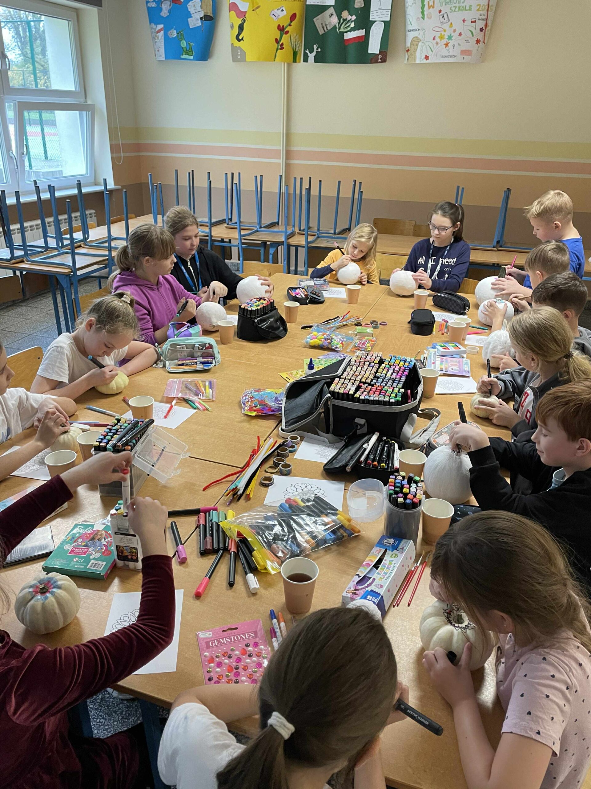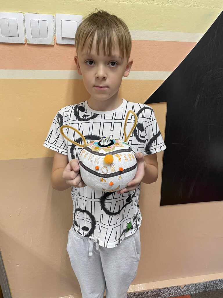 Podczas zajęć uczniowie ozdabiali białe dynie kolorowymi mandalami, skupiając się na kształtach, barwach i własnych emocjach. W tle towarzyszyła im spokojna, relaksacyjna muzyka, a w przerwach mogli rozgrzać się aromatyczną herbatą malinową.