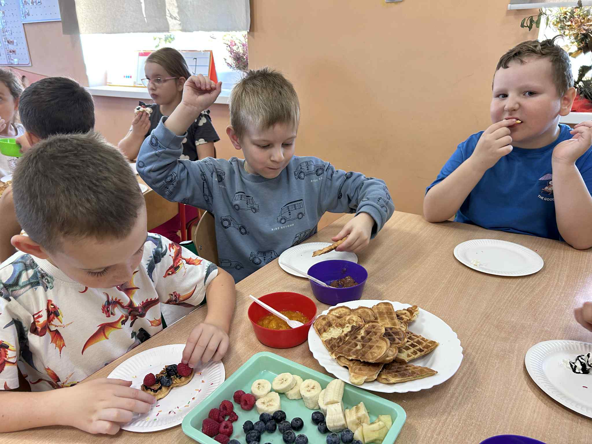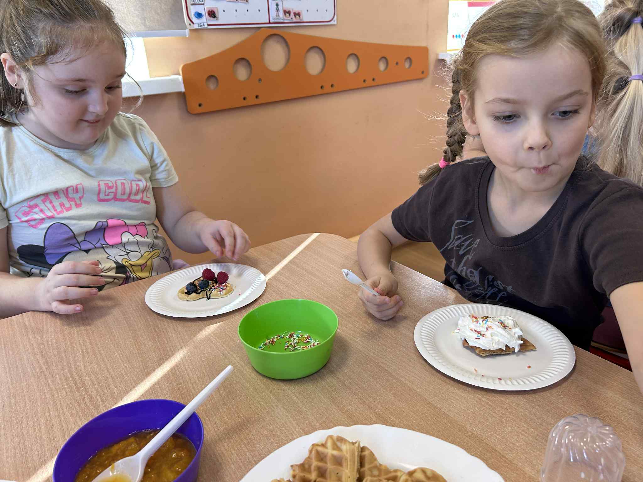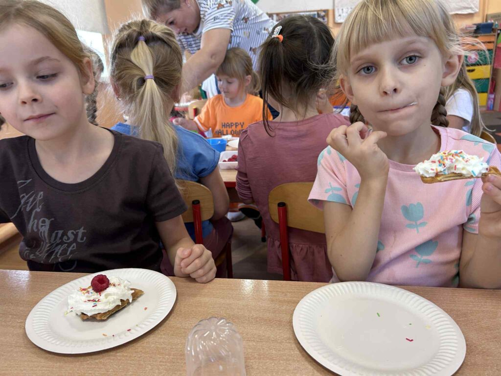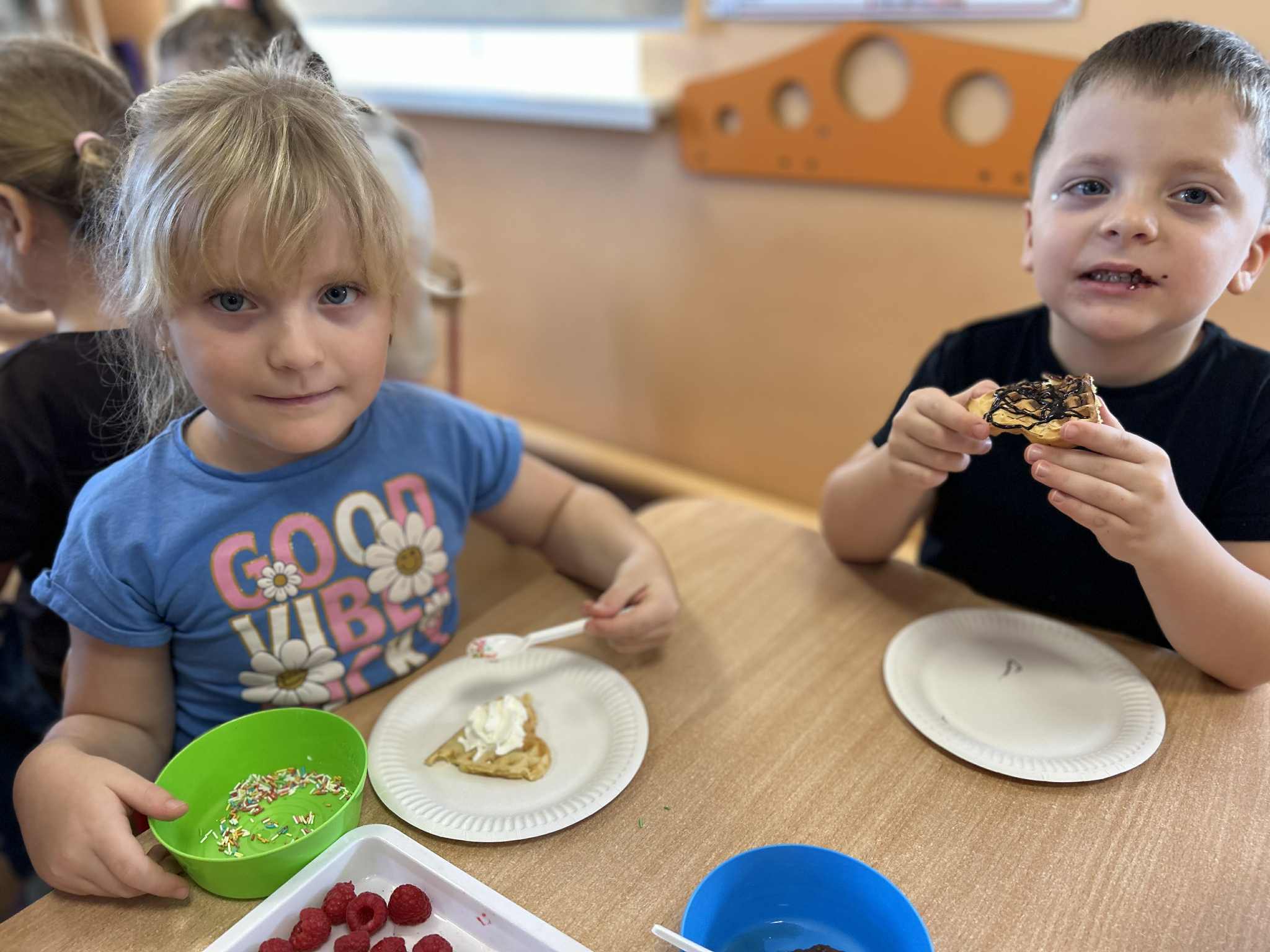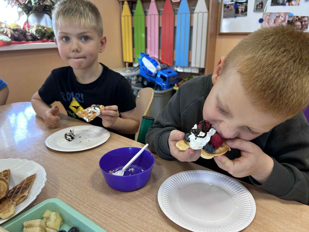 Nie zabrakło owoców, bitej śmietany i kolorowych dodatków. Dzieci mogły samodzielnie zdecydować, jak ozdobią swojego gofra – dzięki temu każdy był wyjątkowy i smakował doskonale!