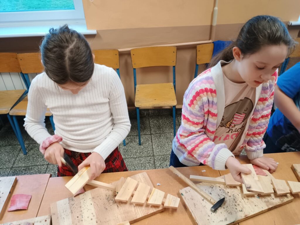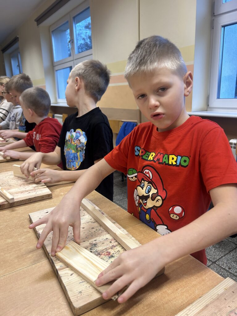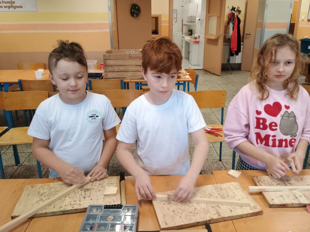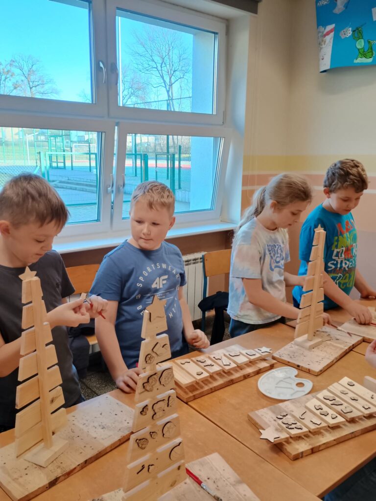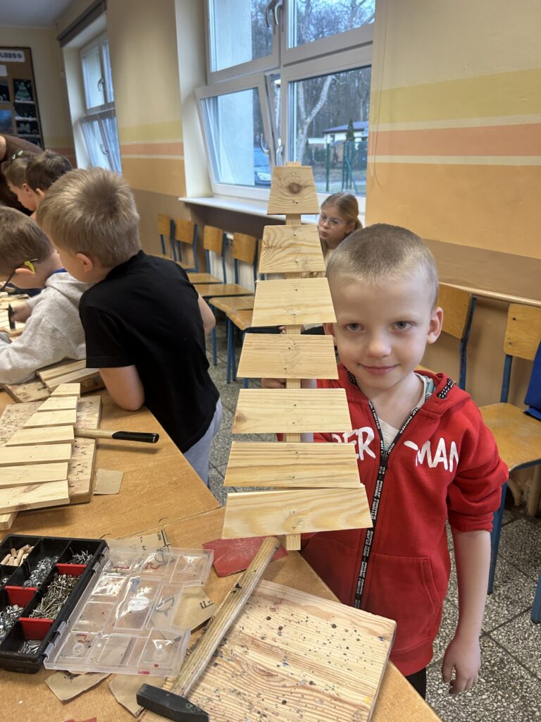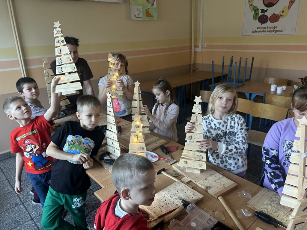A w czwartek 11 grudnia 2025 roku uczniowie klas I-III uczestniczyli w świątecznych warsztatach stolarskich, gdzie pod okiem pań instruktorek stolarstwa, każdy wykonał drewnianą choinkę. Nie było to łatwe i lekkie zajęcie. Uczniowie mogli poczuć wysiłek i wkład pracy jaki trzeba włożyć, aby powstał zadowalający efekt. Wszyscy byli dumni z dzieł własnych rąk.