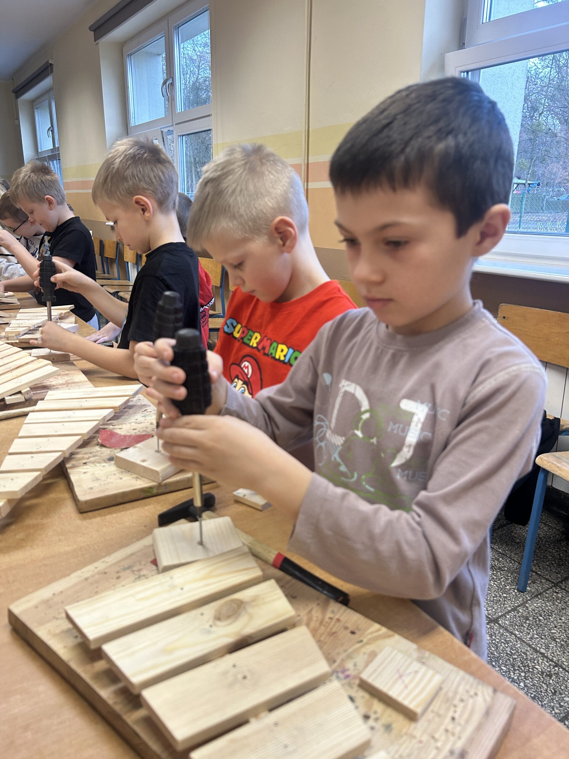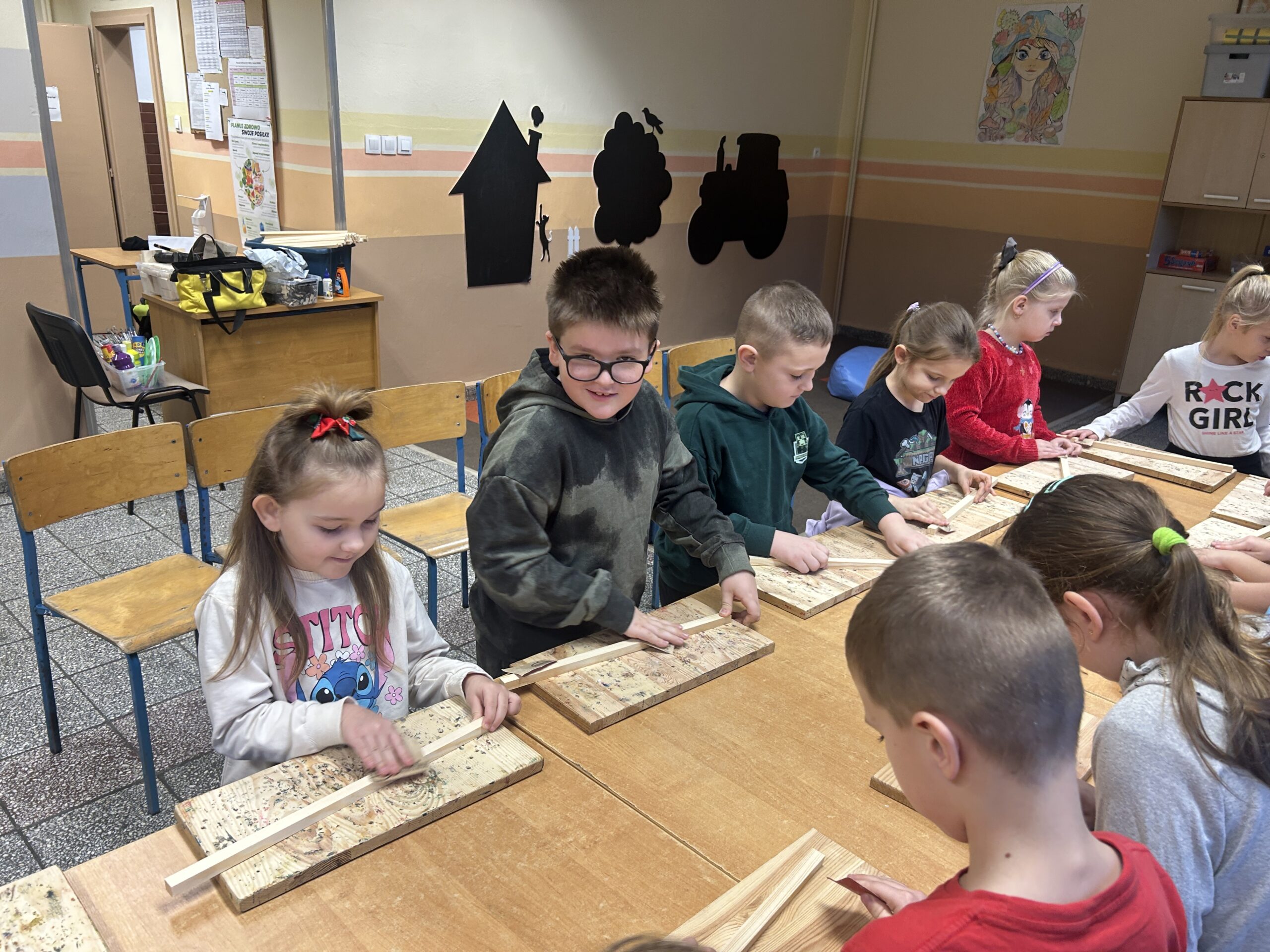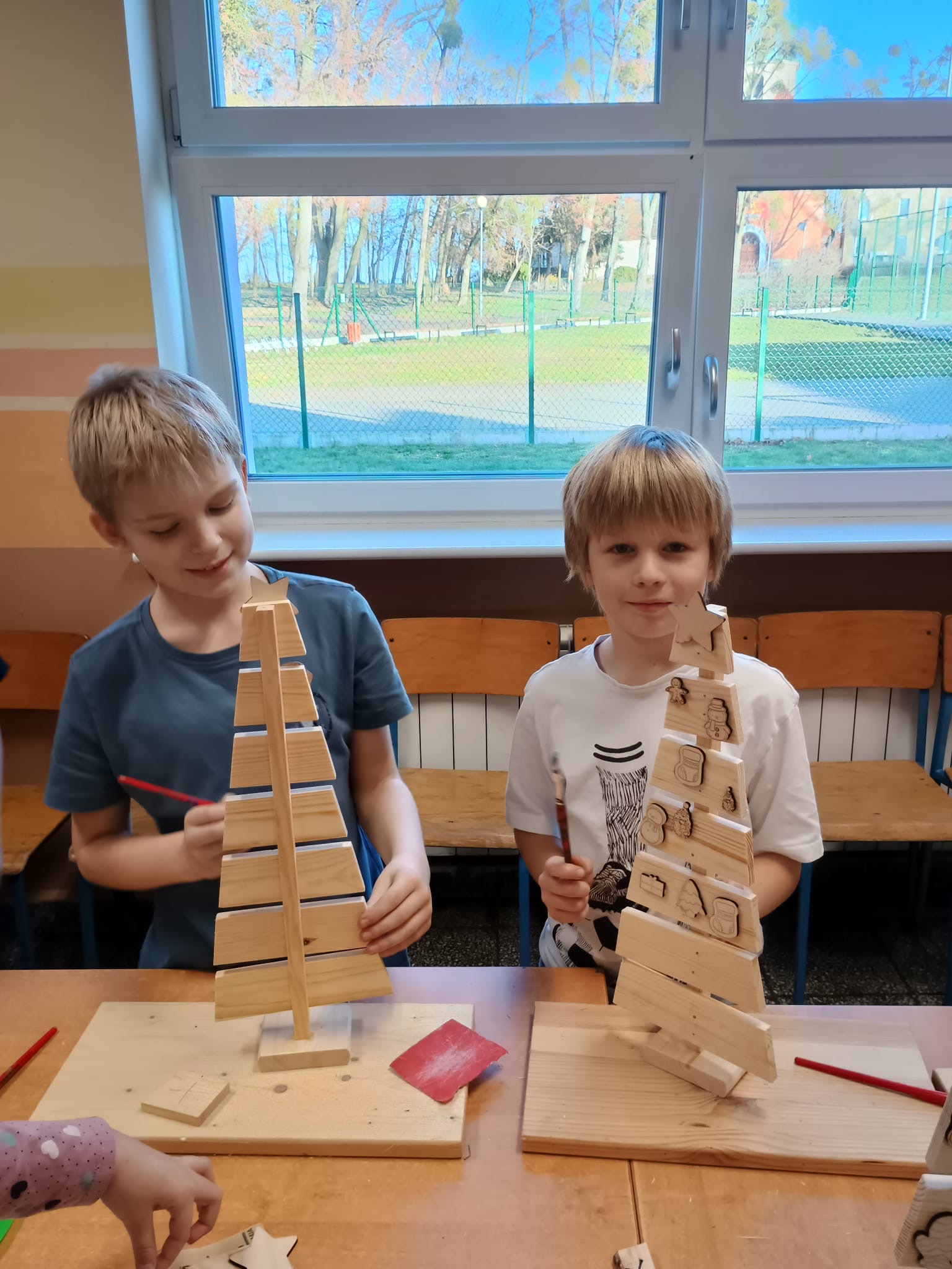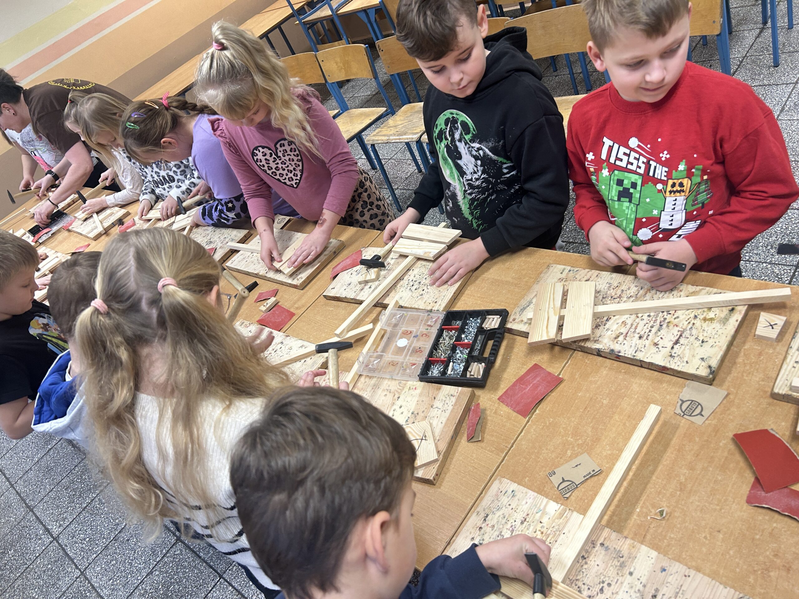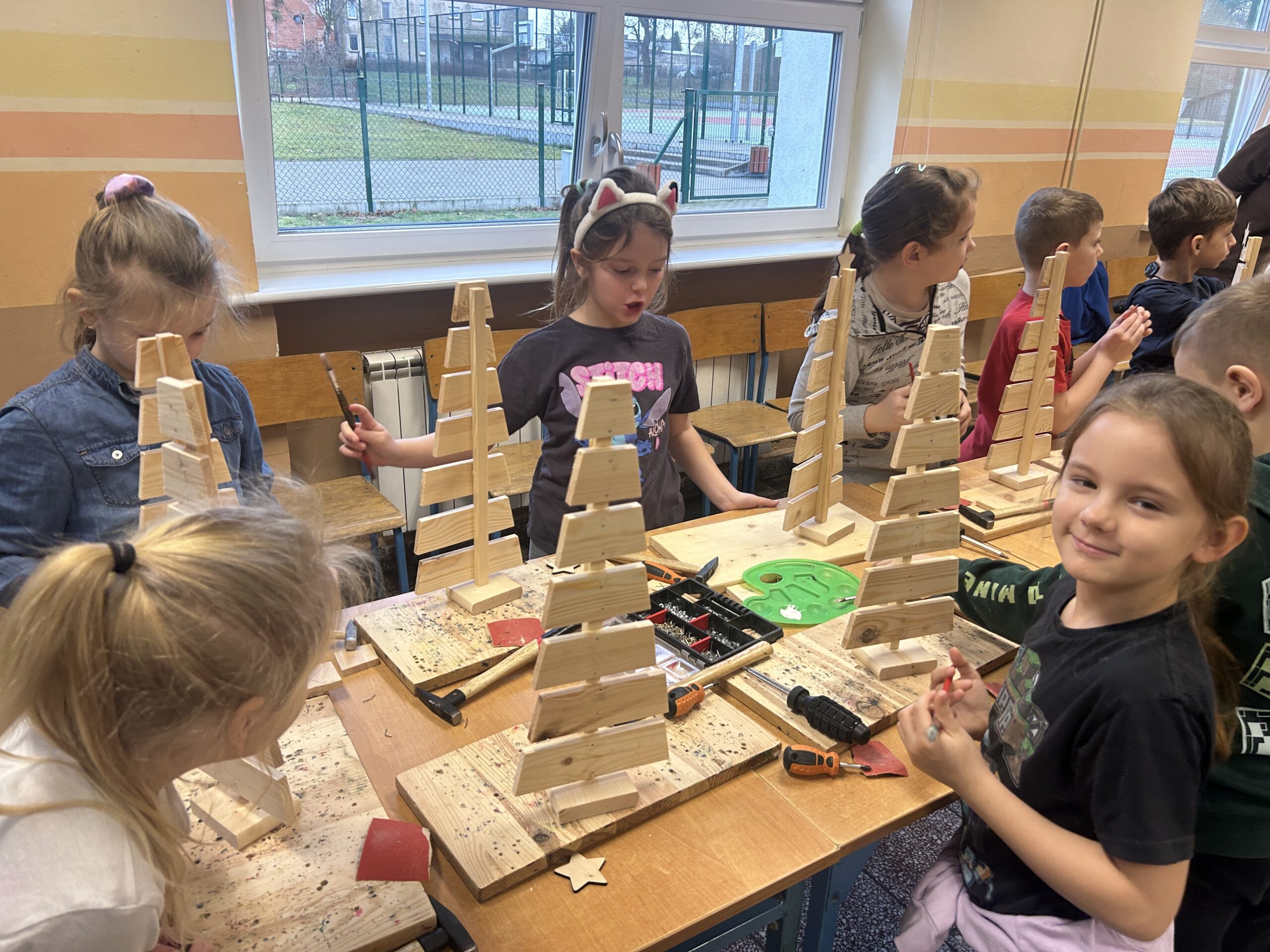 A w czwartek 11 grudnia 2025 roku uczniowie klas I-III uczestniczyli w świątecznych warsztatach stolarskich, gdzie pod okiem pań instruktorek stolarstwa, każdy wykonał drewnianą choinkę. Nie było to łatwe i lekkie zajęcie. Uczniowie mogli poczuć wysiłek i wkład pracy jaki trzeba włożyć, aby powstał zadowalający efekt. Wszyscy byli dumni z dzieł własnych rąk.