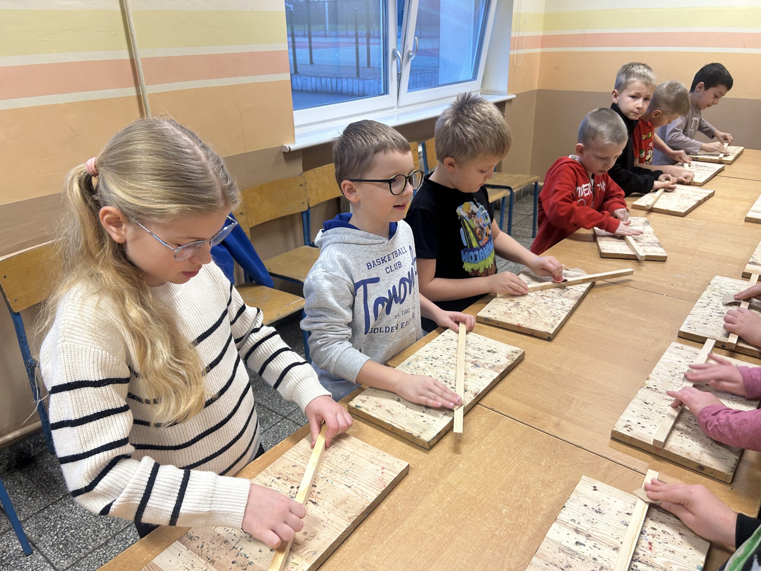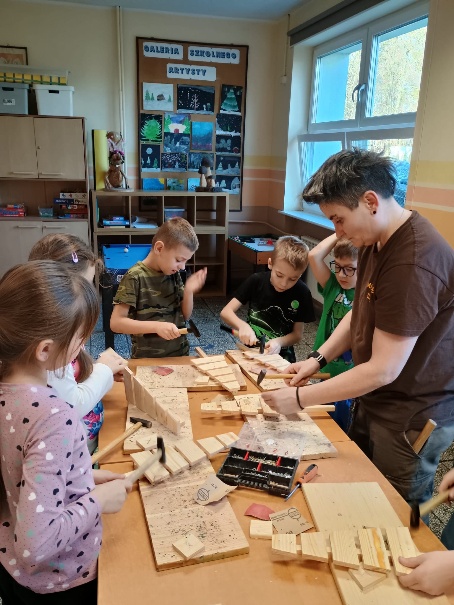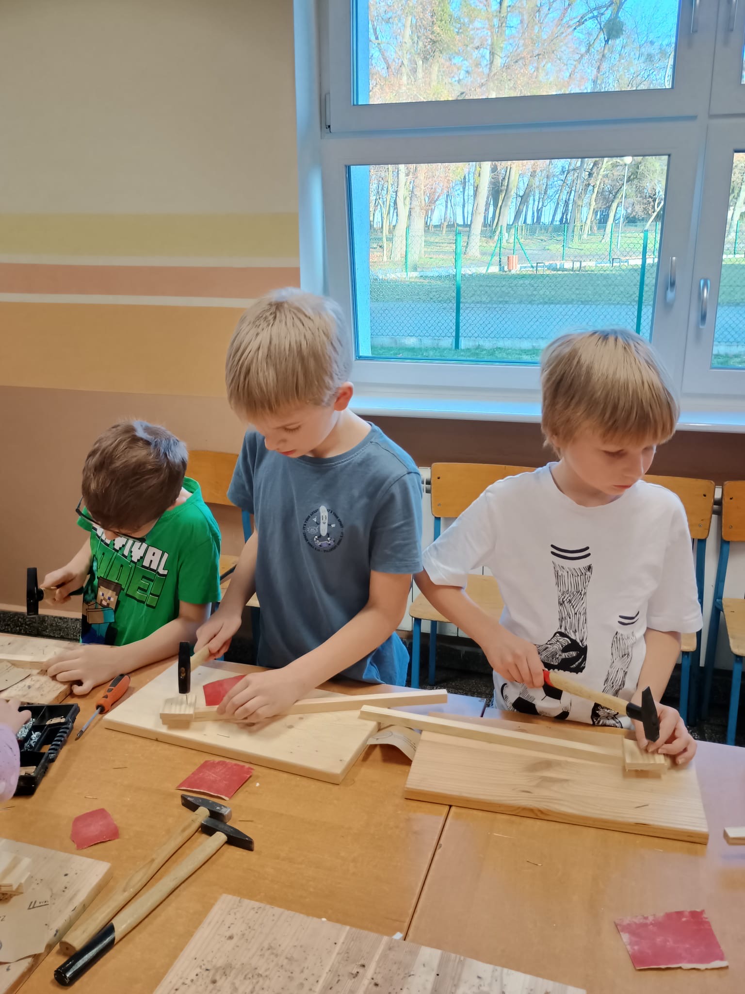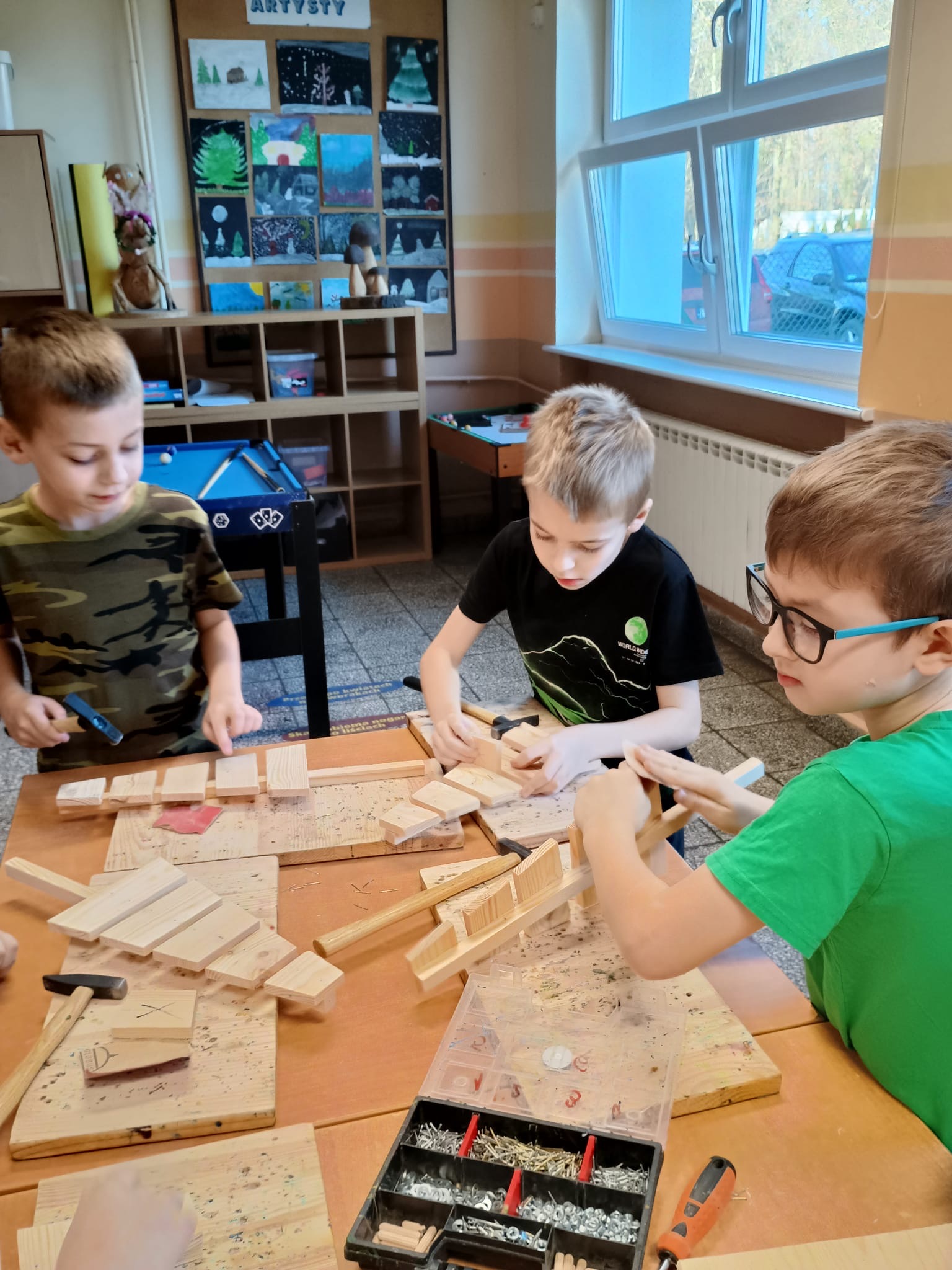 A w czwartek 11 grudnia 2025 roku uczniowie klas I-III uczestniczyli w świątecznych warsztatach stolarskich, gdzie pod okiem pań instruktorek stolarstwa, każdy wykonał drewnianą choinkę. Nie było to łatwe i lekkie zajęcie. Uczniowie mogli poczuć wysiłek i wkład pracy jaki trzeba włożyć, aby powstał zadowalający efekt. Wszyscy byli dumni z dzieł własnych rąk.
