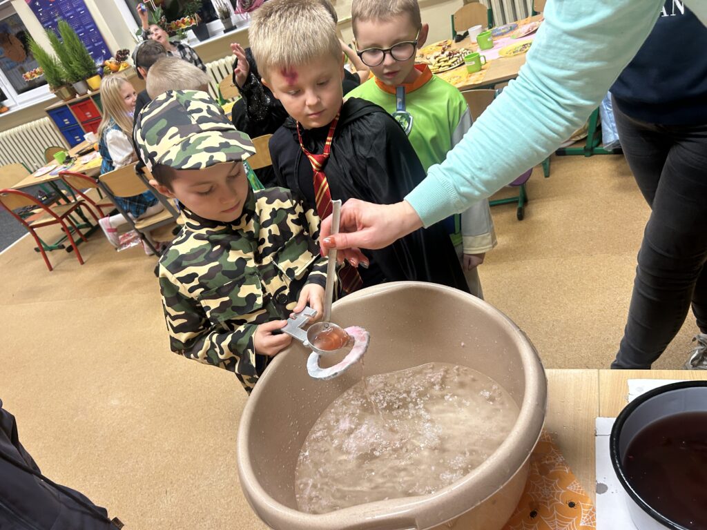 Uczniowie klasy pierwszej uczestniczyli w popołudniowym spotkaniu andrzejkowym w ostatnim tygodniu listopada. Przygotowali ciekawe stroje i przebrania związane z wróżeniem i tajemniczością. Podczas imprezy poznaliśmy tradycje andrzejkowe i przeprowadziliśmy wróżby na przyszłość – były buty, które wskazały osoby pierwsze do ożenku i zamążpójścia, przekłuwanie serc z imionami, lanie wosku i odczytywanie jego kształtu. Wróżyliśmy też z kolorów, liczb i symboli zawodów. Spotkanie upływało w wesołej atmosferze, a kulminacją był spacer z latarkami w ciemnościach przez korytarze szkolne. I tu czekały na nas ekscytujące niespodzianki, które napędziły nam nie małego stracha. Na pocieszenie częstowaliśmy się słodkościami i owocami przygotowanym przez naszych rodziców. To był niezapomniany wieczór.