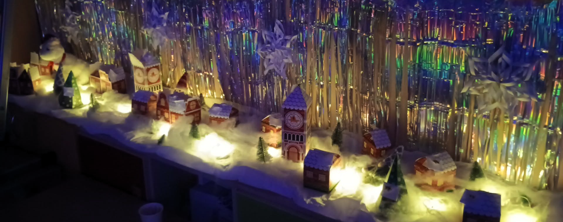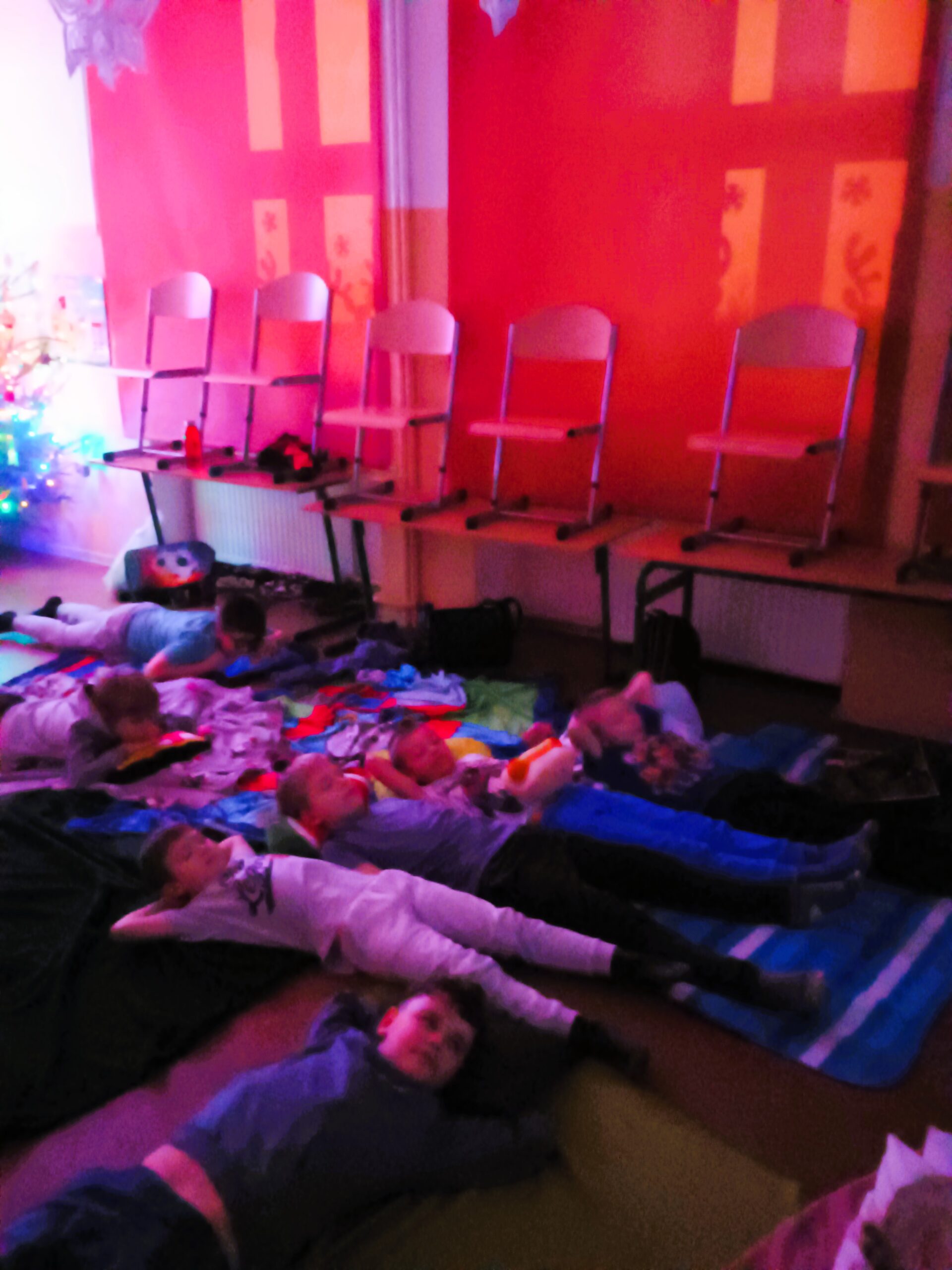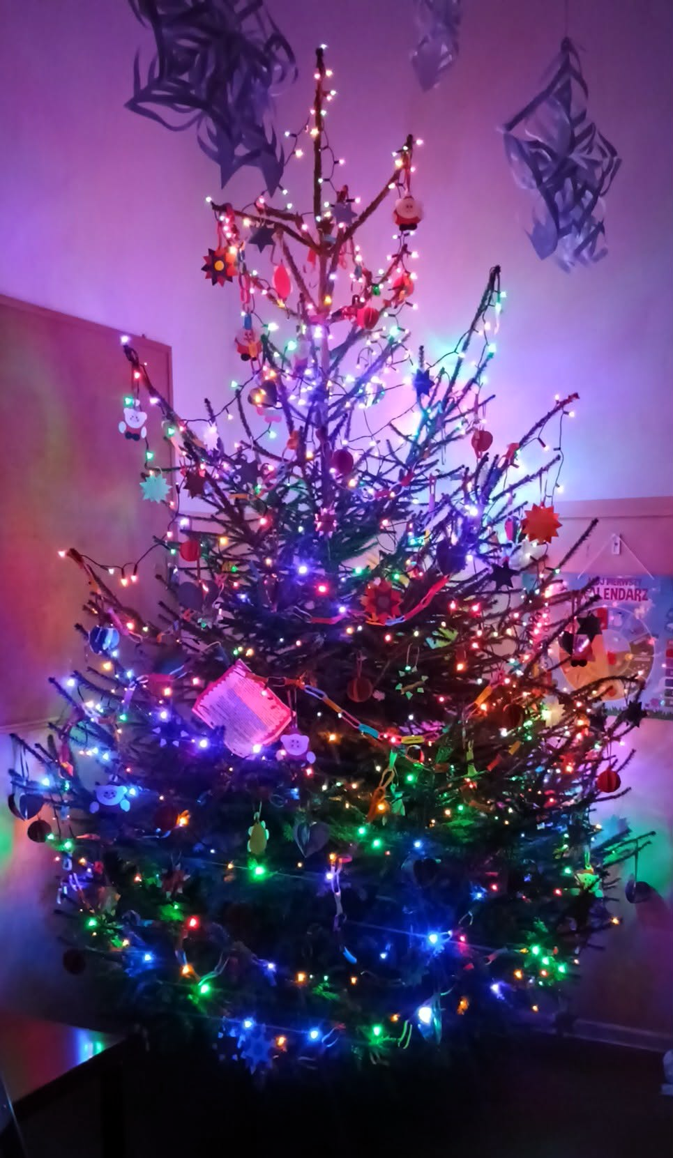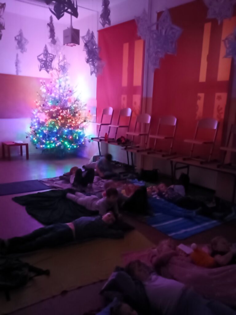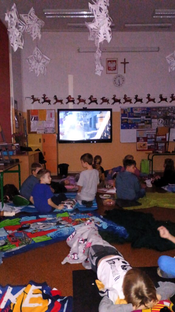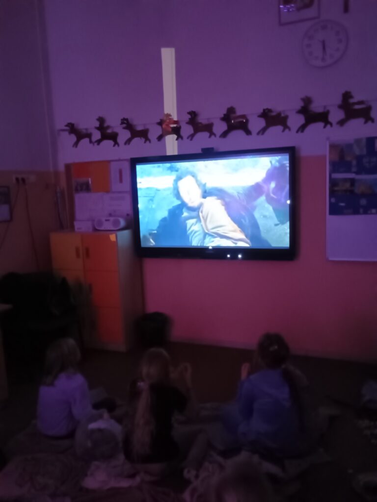 Wieczór filmowy był jedną z niespodzianek z klasowego kalendarza adwentowego. Dzieci codziennie otwierały domek ze słodyczami, niespodziankami i świątecznymi zadaniami do wykonania.