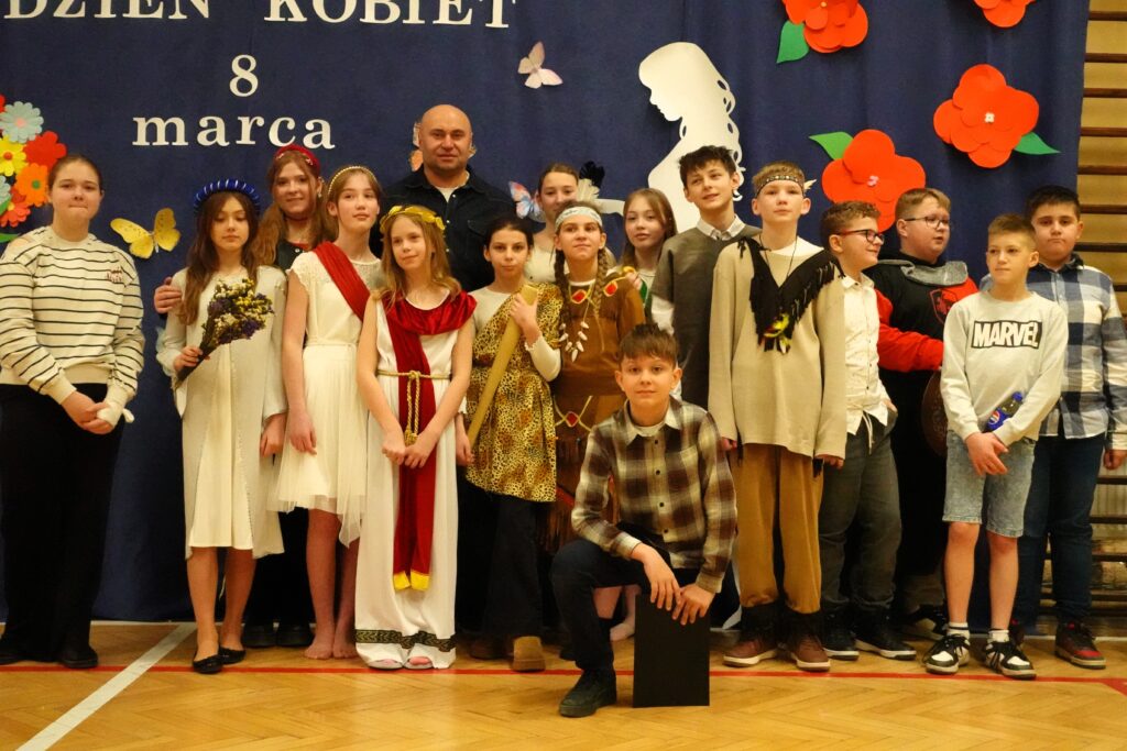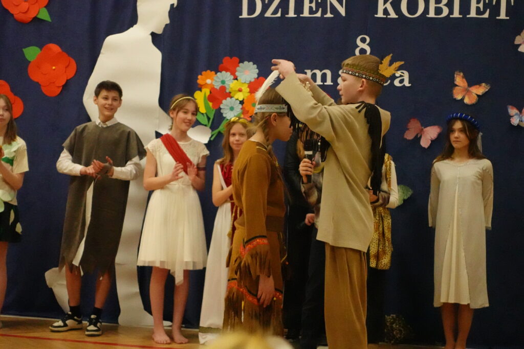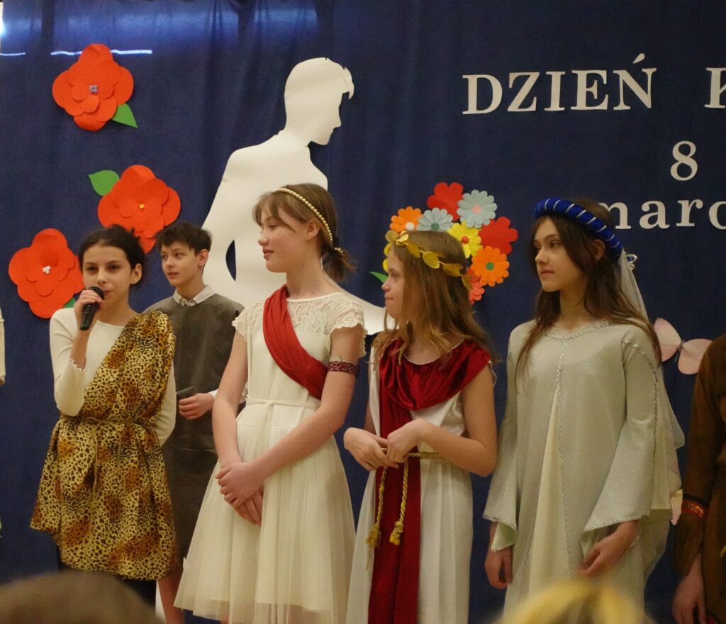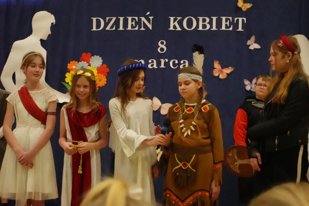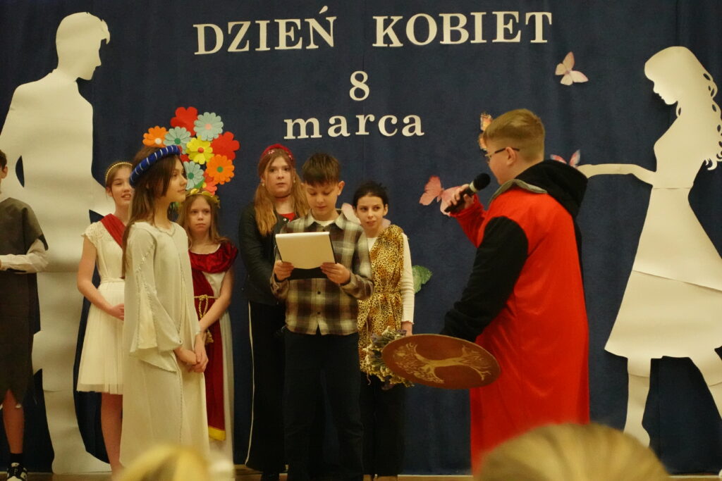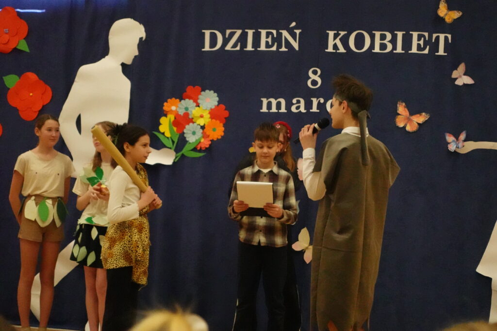 W naszej szkole odbył się wyjątkowy apel z okazji Dnia Kobiet przygotowany przez uczniów klasy 5. Było to barwne i pełne humoru przedstawienie, które przeniosło widzów w podróż przez różne epoki, ukazując obraz kobiety na przestrzeni dziejów.