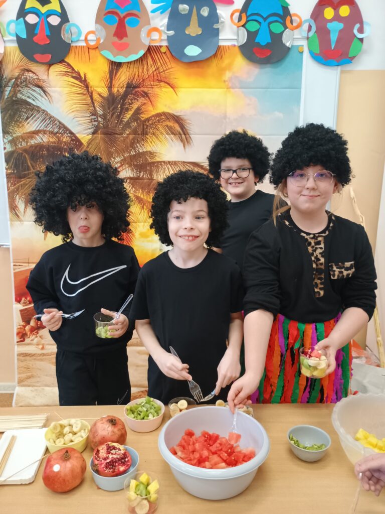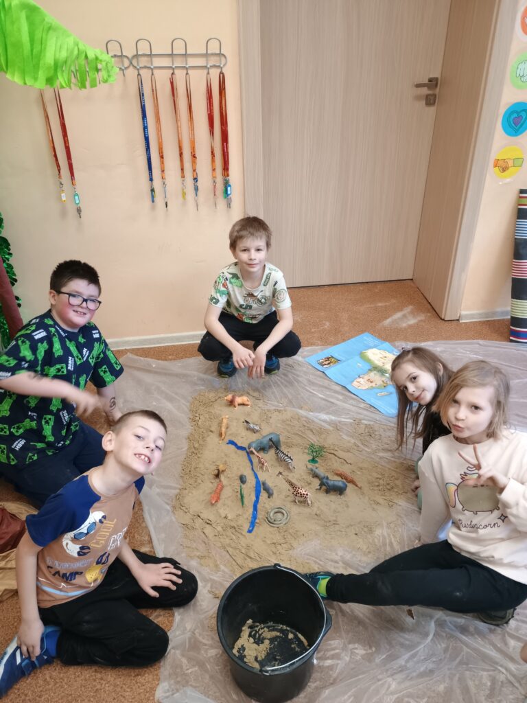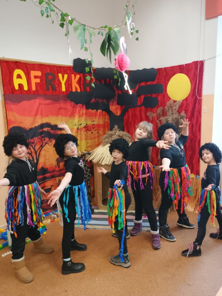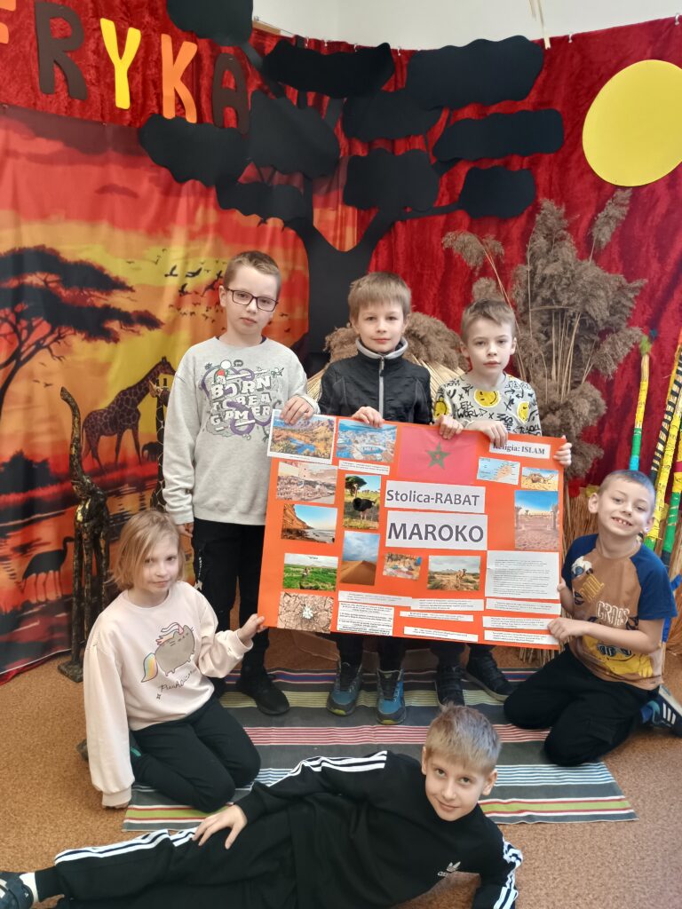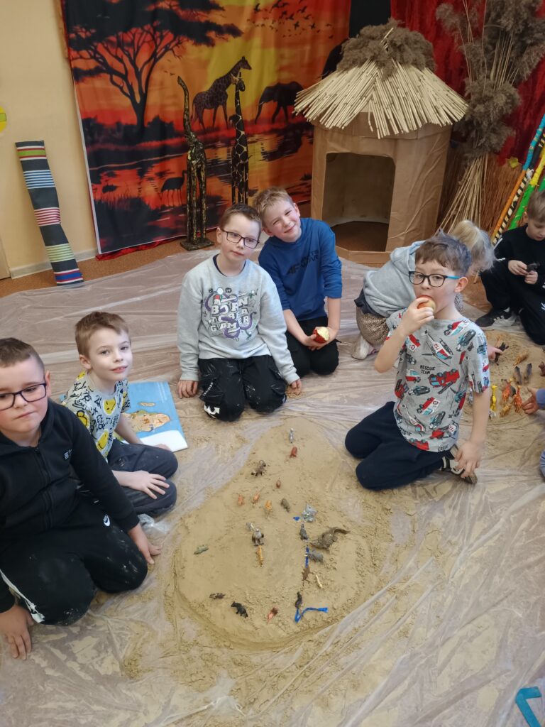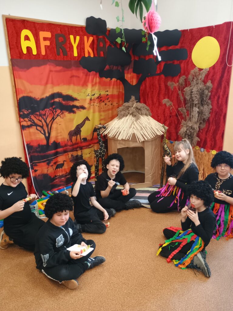 Kolejnym kontynentem, który omawialiśmy w ramach naszego projektu była Afryka. Tym razem projekt trwał aż dwa tygodnie, w związku z omawianą lekturą Łukasza Wierzbickiego pt. Afryka Kazika. W naszej klasie pojawiła się chatka Masaja oraz dżungla afrykańska na suficie. Poznaliśmy m.in. kilka państw afrykańskich i ich stolice, najdłuższą rzekę, najwyższy szczyt, największą wyspę, strefy klimatyczne, krajobrazy oraz florę i faunę Czarnego Lądu. Na warsztatach kulinarnych wykonaliśmy sałatkę i szaszłyki z egzotycznych owoców, na zajęciach plastycznych- maski afrykańskich wojowników, na zajęciach technicznych chłopcy zrobili włócznie masajskie, a dziewczynki- spódniczki z krepy. Dużą frajdą było wykonanie dużych makiet Afryki z piasku, na których zaznaczaliśmy obiekty geograficzne oraz wyznaczaliśmy trasę jaką przebył bohater naszej lektury pan Kazimierz Nowak., dla którego zaprojektowaliśmy rowery. Na zakończenie projektu udaliśmy się do kina IMAX na film pt. Afrykańska przygoda oraz do Palmiarni w Poznaniu, aby obejrzeć okazy roślin z Afryki oraz Ameryki Południowej, którą omawialiśmy po zakończeniu projektu afrykańskiego.