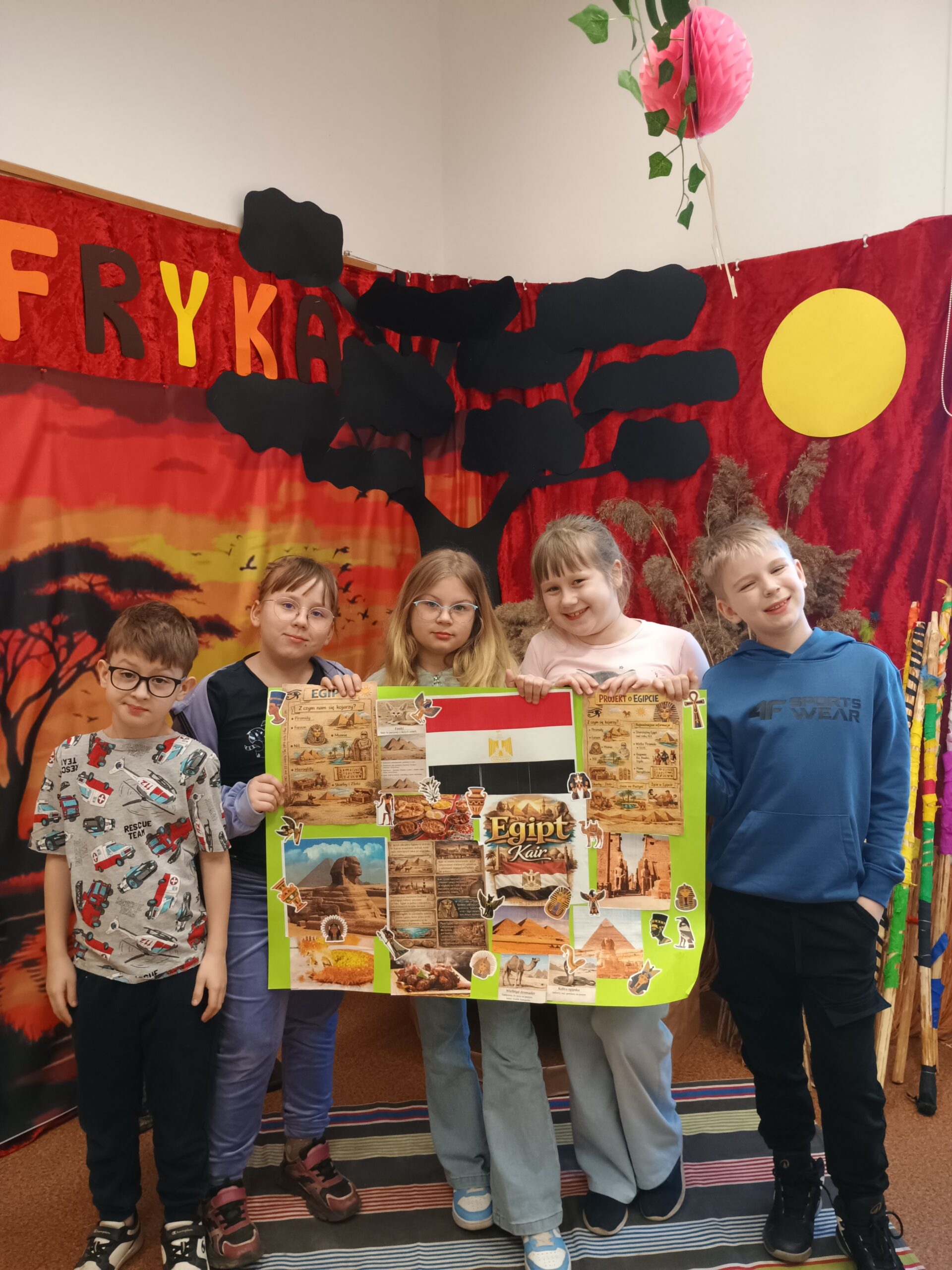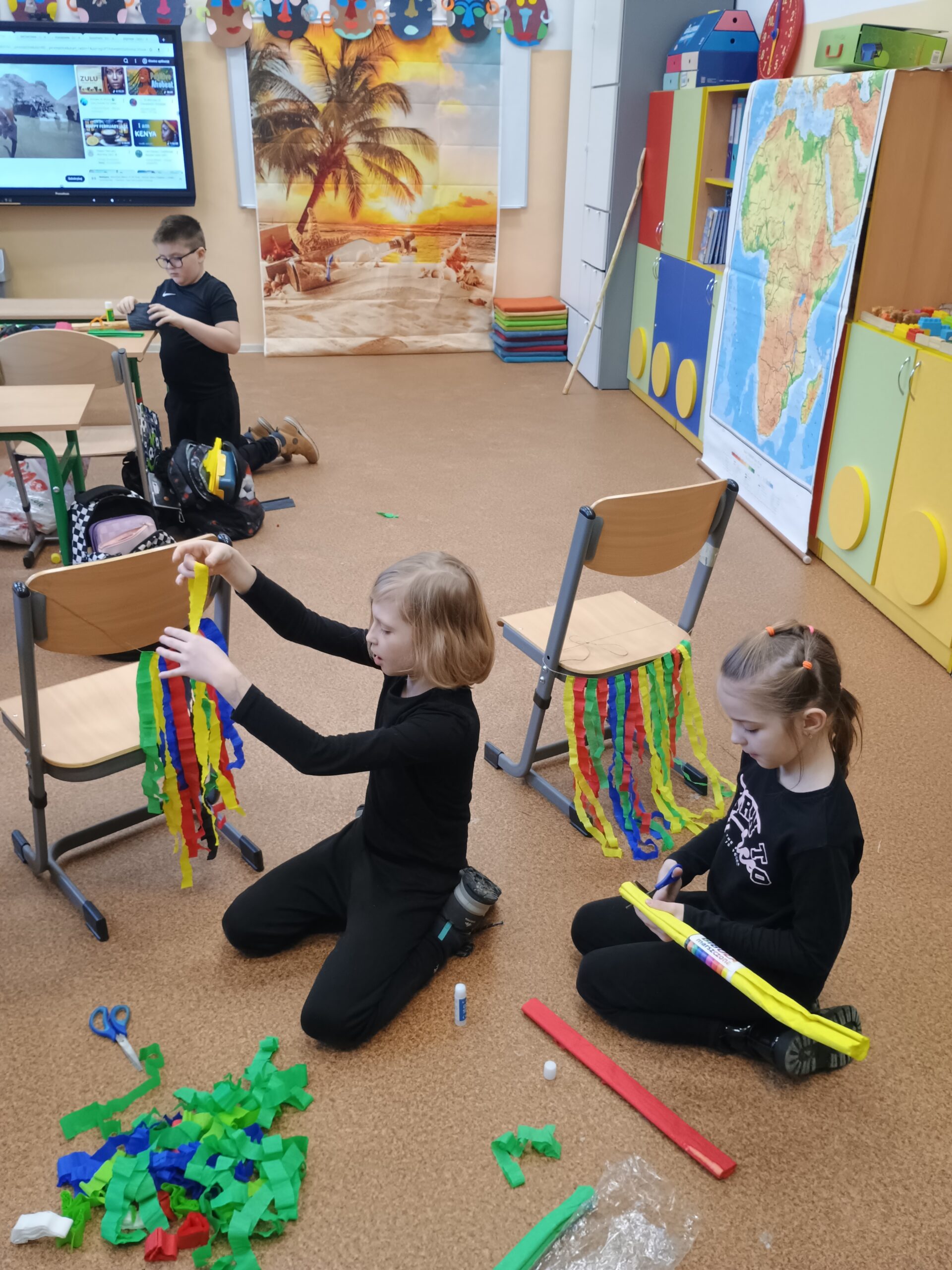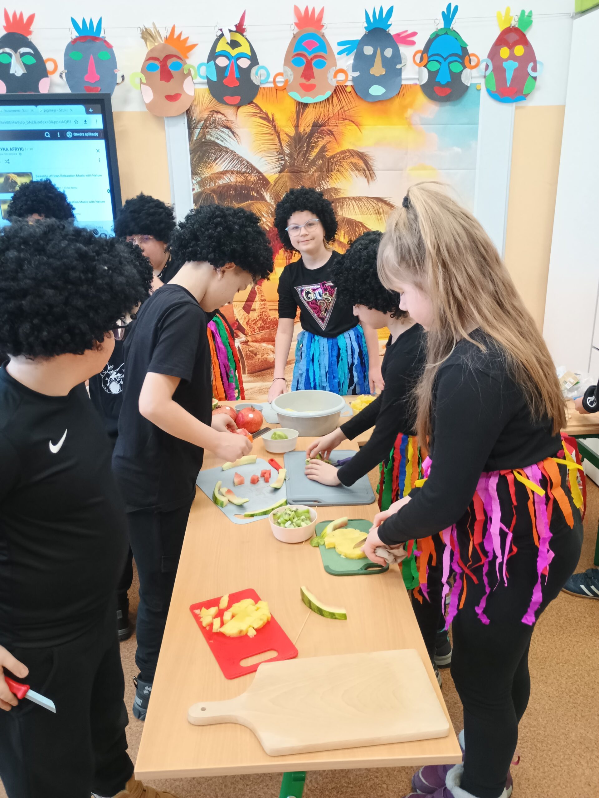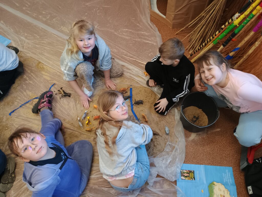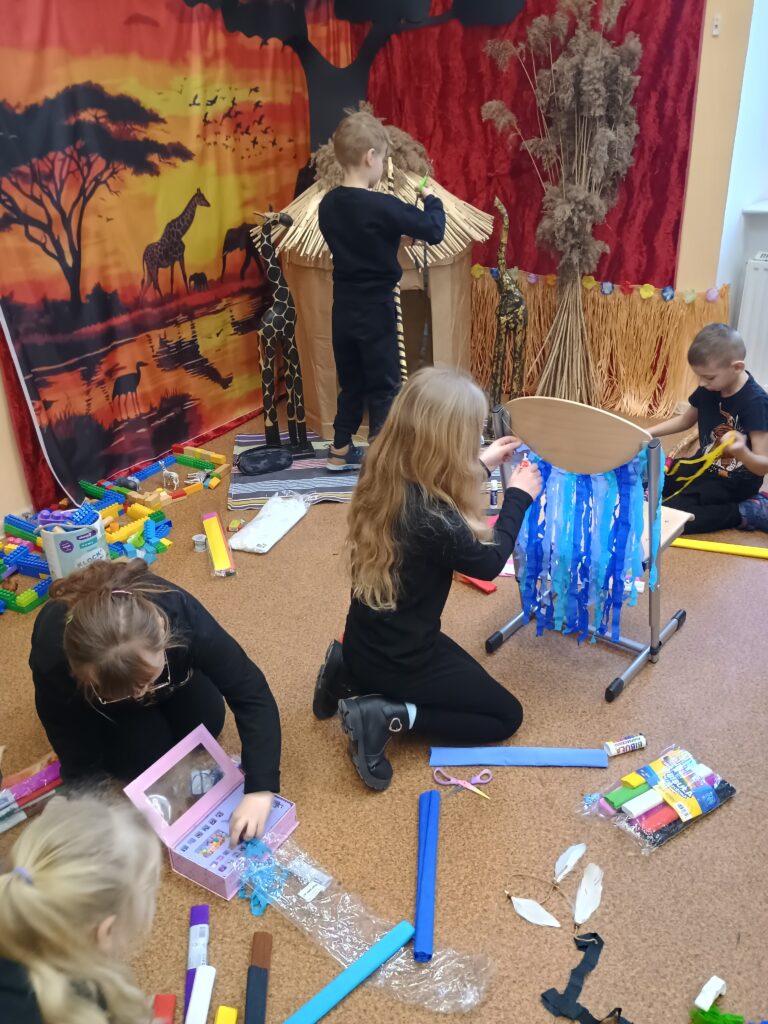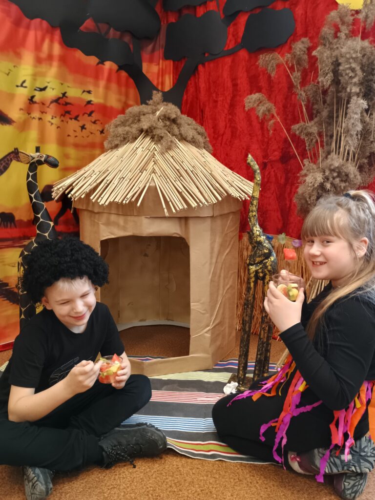 Kolejnym kontynentem, który omawialiśmy w ramach naszego projektu była Afryka. Tym razem projekt trwał aż dwa tygodnie, w związku z omawianą lekturą Łukasza Wierzbickiego pt. Afryka Kazika. W naszej klasie pojawiła się chatka Masaja oraz dżungla afrykańska na suficie. Poznaliśmy m.in. kilka państw afrykańskich i ich stolice, najdłuższą rzekę, najwyższy szczyt, największą wyspę, strefy klimatyczne, krajobrazy oraz florę i faunę Czarnego Lądu. Na warsztatach kulinarnych wykonaliśmy sałatkę i szaszłyki z egzotycznych owoców, na zajęciach plastycznych- maski afrykańskich wojowników, na zajęciach technicznych chłopcy zrobili włócznie masajskie, a dziewczynki- spódniczki z krepy. Dużą frajdą było wykonanie dużych makiet Afryki z piasku, na których zaznaczaliśmy obiekty geograficzne oraz wyznaczaliśmy trasę jaką przebył bohater naszej lektury pan Kazimierz Nowak., dla którego zaprojektowaliśmy rowery. Na zakończenie projektu udaliśmy się do kina IMAX na film pt. Afrykańska przygoda oraz do Palmiarni w Poznaniu, aby obejrzeć okazy roślin z Afryki oraz Ameryki Południowej, którą omawialiśmy po zakończeniu projektu afrykańskiego.