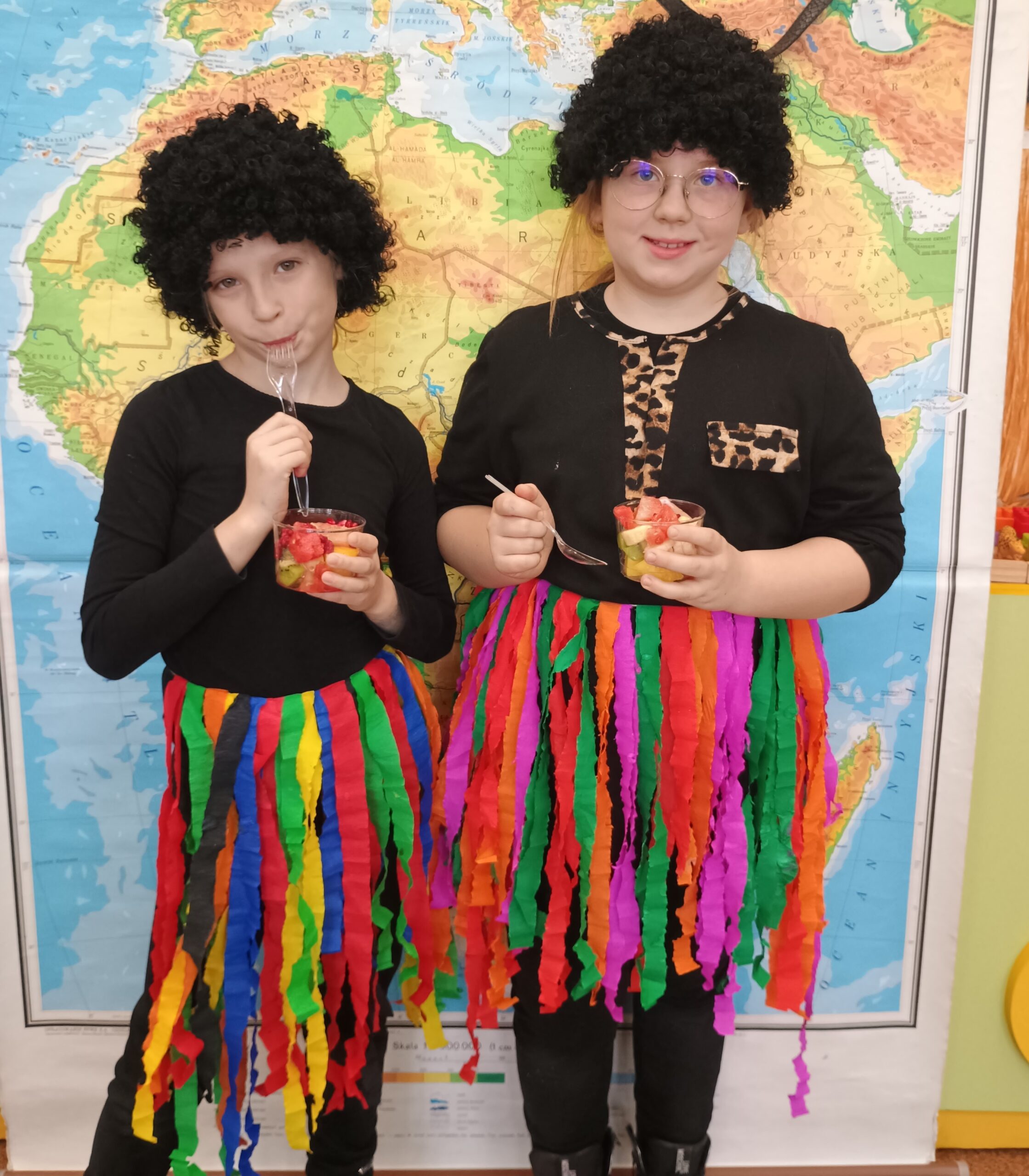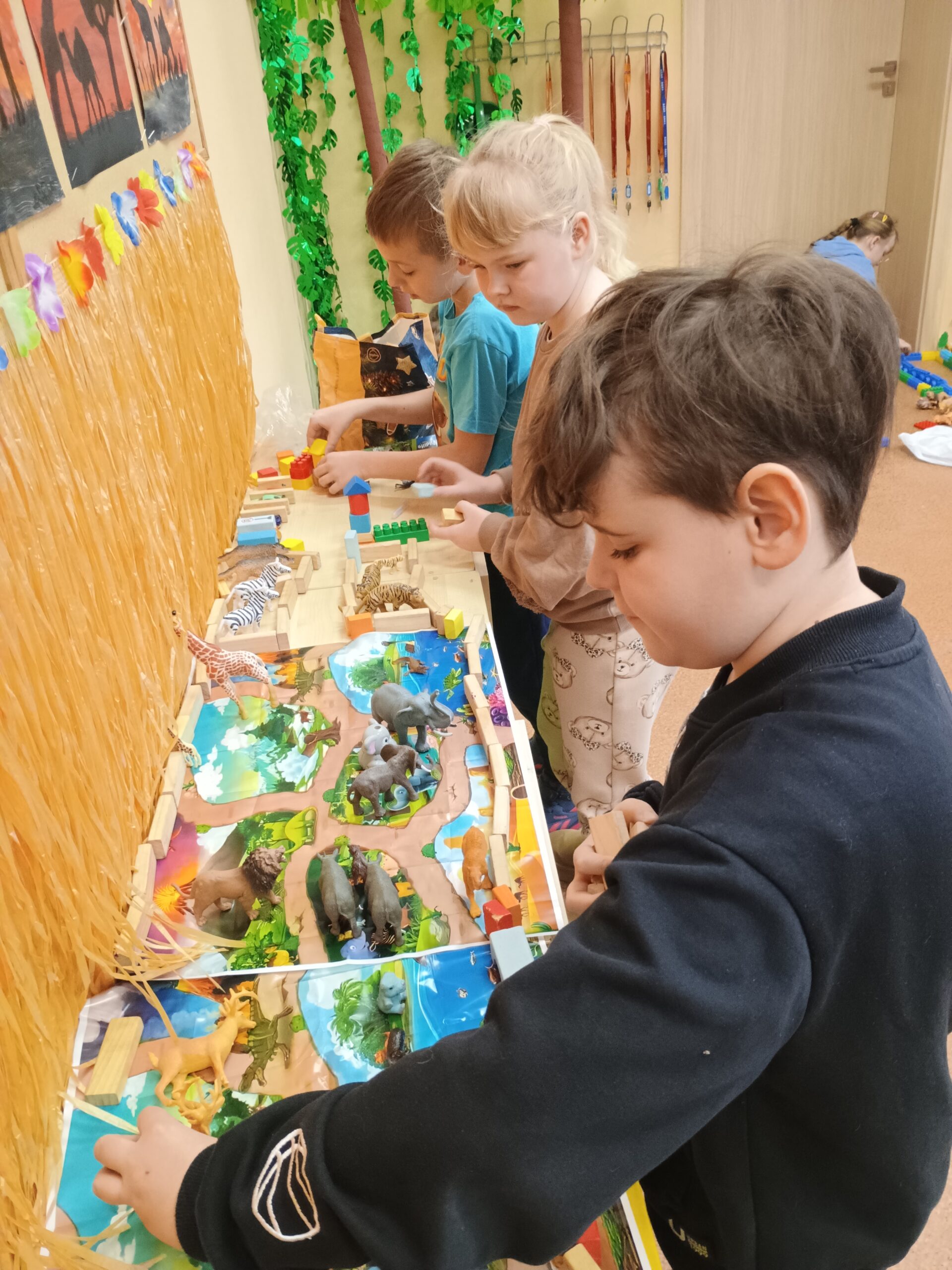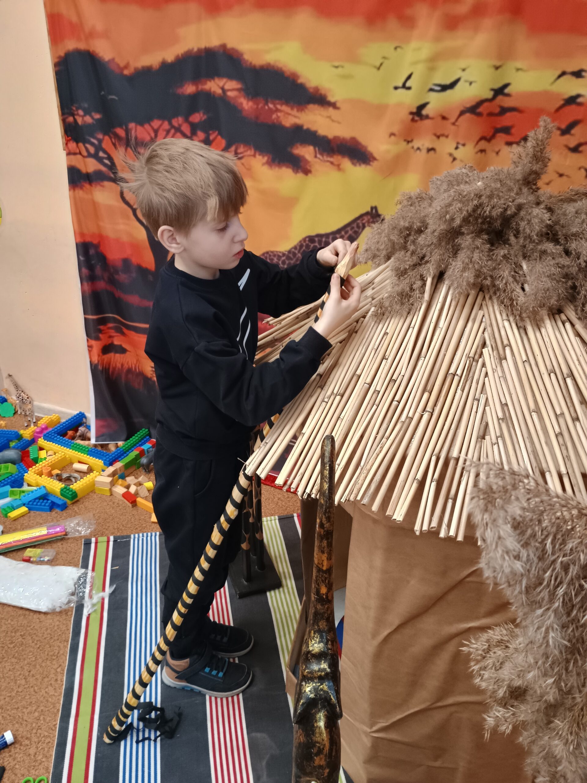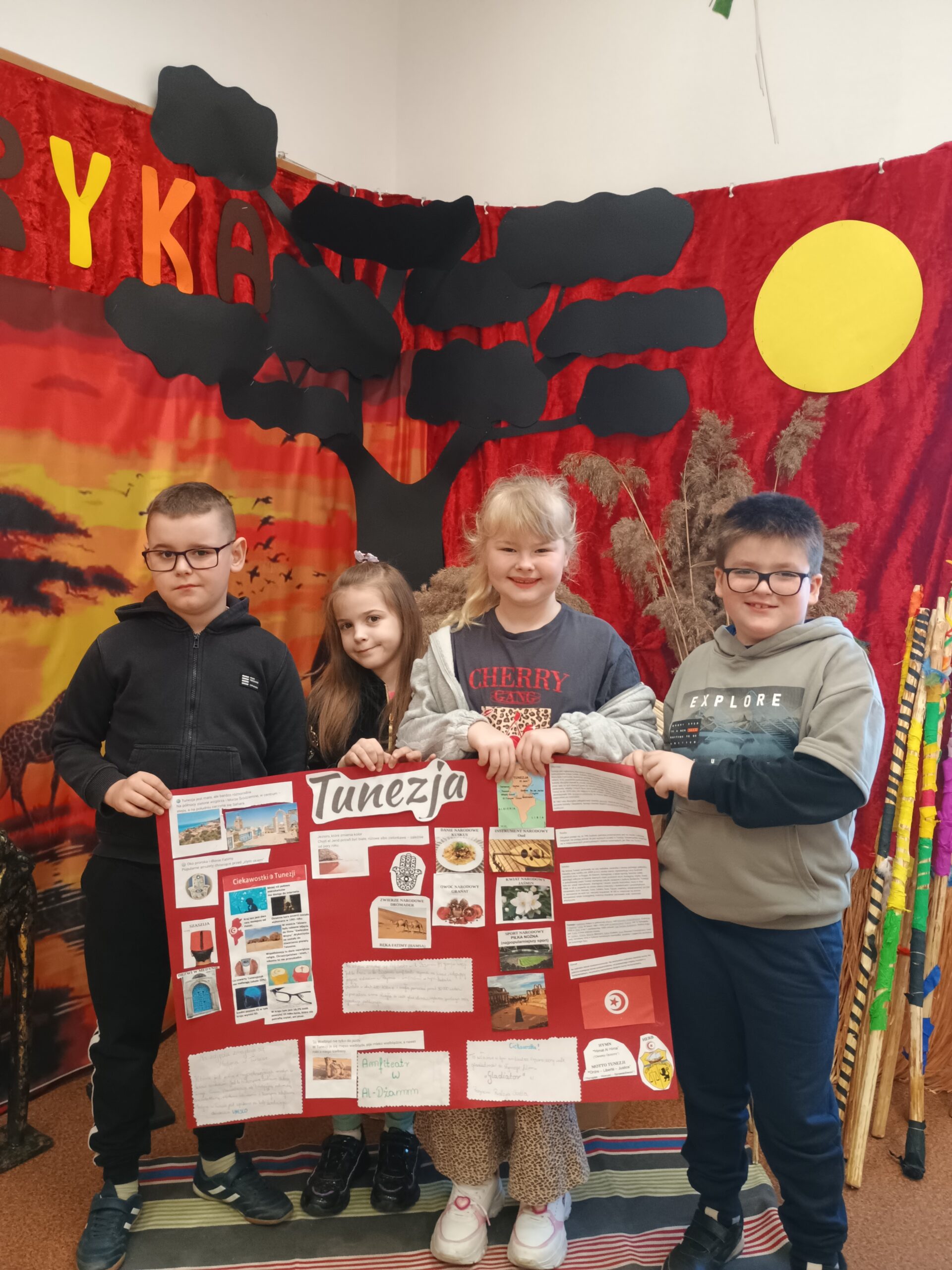 Kolejnym kontynentem, który omawialiśmy w ramach naszego projektu była Afryka. Tym razem projekt trwał aż dwa tygodnie, w związku z omawianą lekturą Łukasza Wierzbickiego pt. Afryka Kazika. W naszej klasie pojawiła się chatka Masaja oraz dżungla afrykańska na suficie. Poznaliśmy m.in. kilka państw afrykańskich i ich stolice, najdłuższą rzekę, najwyższy szczyt, największą wyspę, strefy klimatyczne, krajobrazy oraz florę i faunę Czarnego Lądu. Na warsztatach kulinarnych wykonaliśmy sałatkę i szaszłyki z egzotycznych owoców, na zajęciach plastycznych- maski afrykańskich wojowników, na zajęciach technicznych chłopcy zrobili włócznie masajskie, a dziewczynki- spódniczki z krepy. Dużą frajdą było wykonanie dużych makiet Afryki z piasku, na których zaznaczaliśmy obiekty geograficzne oraz wyznaczaliśmy trasę jaką przebył bohater naszej lektury pan Kazimierz Nowak., dla którego zaprojektowaliśmy rowery. Na zakończenie projektu udaliśmy się do kina IMAX na film pt. Afrykańska przygoda oraz do Palmiarni w Poznaniu, aby obejrzeć okazy roślin z Afryki oraz Ameryki Południowej, którą omawialiśmy po zakończeniu projektu afrykańskiego.