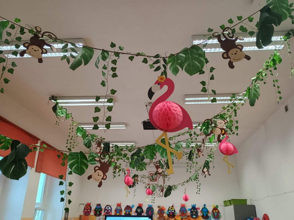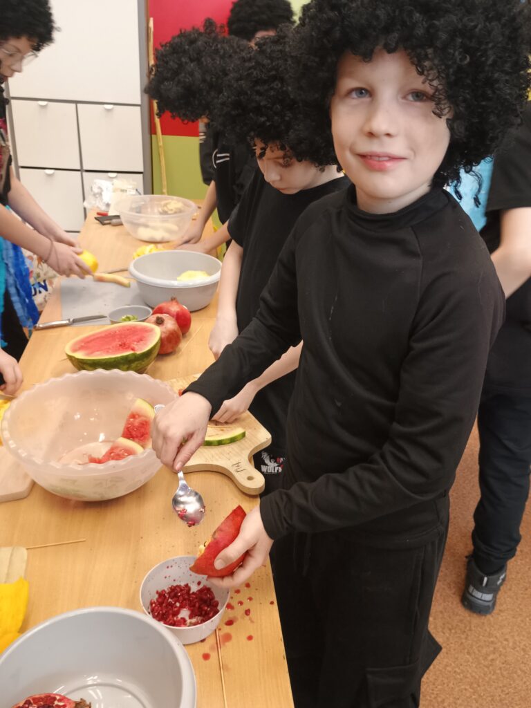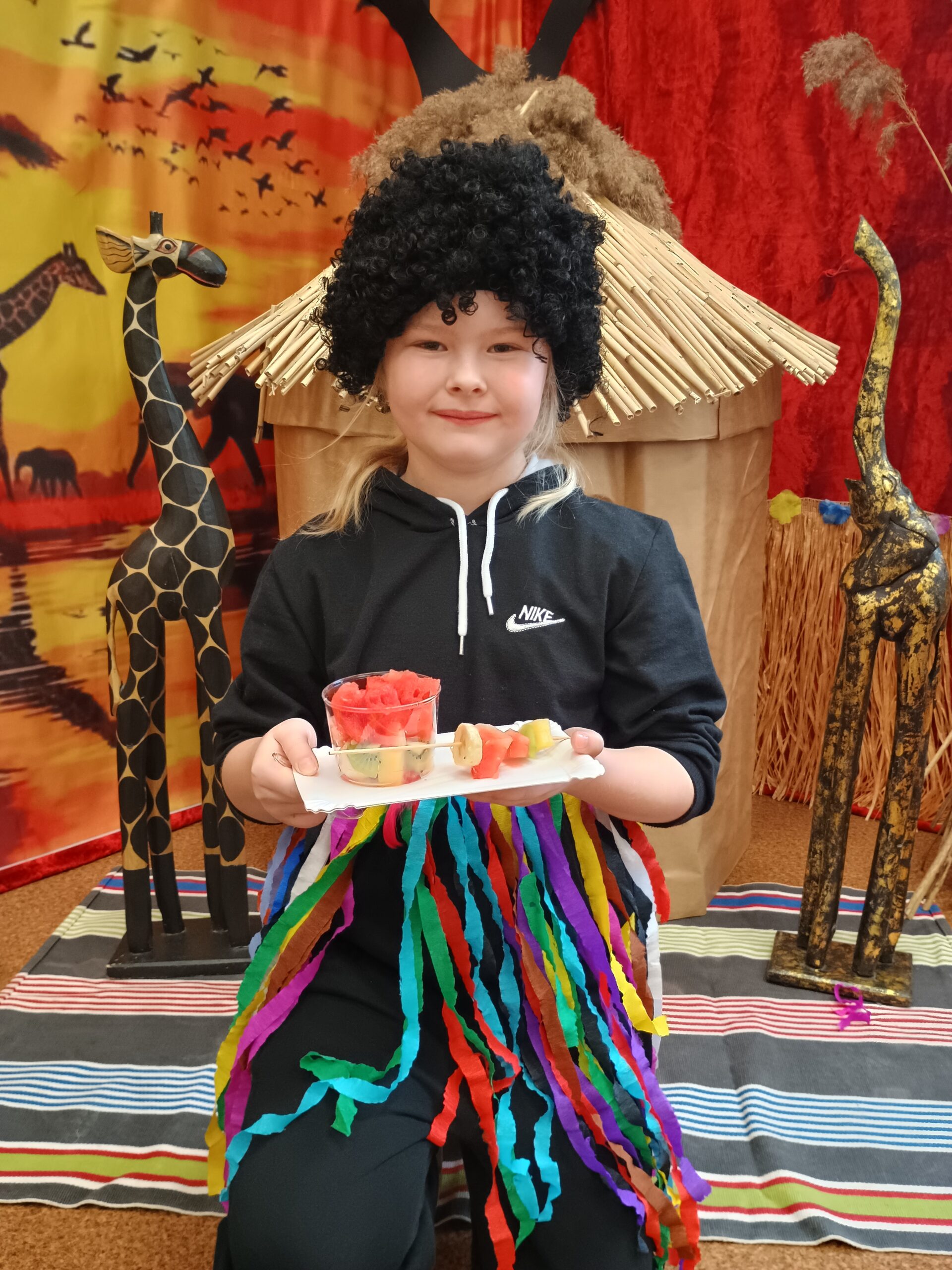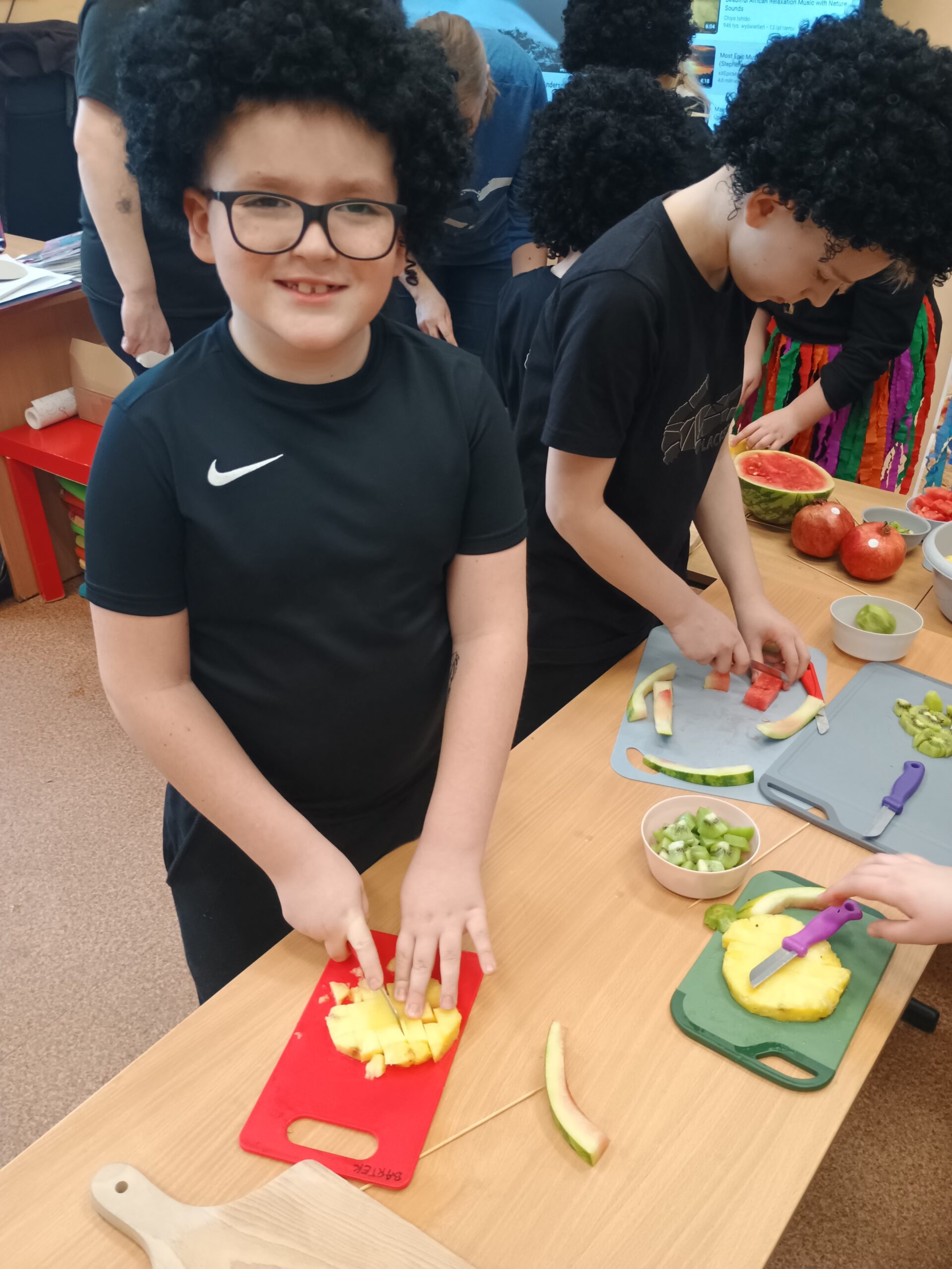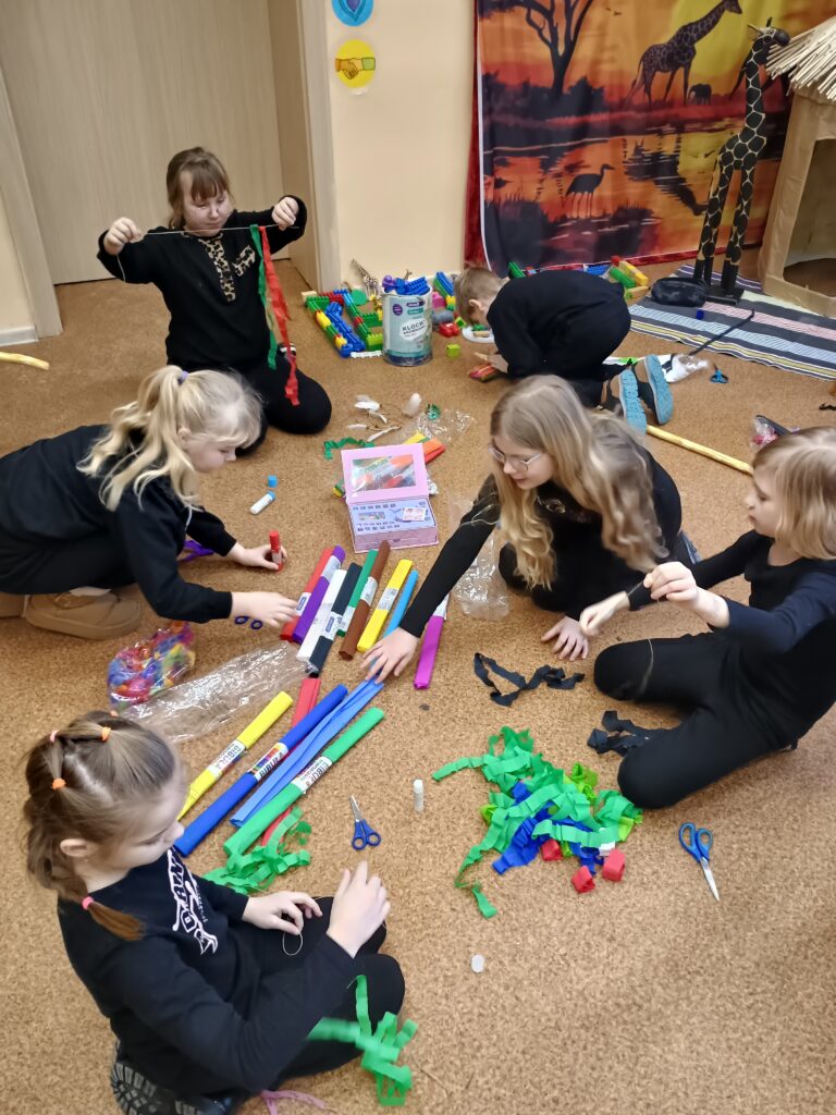 Kolejnym kontynentem, który omawialiśmy w ramach naszego projektu była Afryka. Tym razem projekt trwał aż dwa tygodnie, w związku z omawianą lekturą Łukasza Wierzbickiego pt. Afryka Kazika. W naszej klasie pojawiła się chatka Masaja oraz dżungla afrykańska na suficie. Poznaliśmy m.in. kilka państw afrykańskich i ich stolice, najdłuższą rzekę, najwyższy szczyt, największą wyspę, strefy klimatyczne, krajobrazy oraz florę i faunę Czarnego Lądu. Na warsztatach kulinarnych wykonaliśmy sałatkę i szaszłyki z egzotycznych owoców, na zajęciach plastycznych- maski afrykańskich wojowników, na zajęciach technicznych chłopcy zrobili włócznie masajskie, a dziewczynki- spódniczki z krepy. Dużą frajdą było wykonanie dużych makiet Afryki z piasku, na których zaznaczaliśmy obiekty geograficzne oraz wyznaczaliśmy trasę jaką przebył bohater naszej lektury pan Kazimierz Nowak., dla którego zaprojektowaliśmy rowery. Na zakończenie projektu udaliśmy się do kina IMAX na film pt. Afrykańska przygoda oraz do Palmiarni w Poznaniu, aby obejrzeć okazy roślin z Afryki oraz Ameryki Południowej, którą omawialiśmy po zakończeniu projektu afrykańskiego.