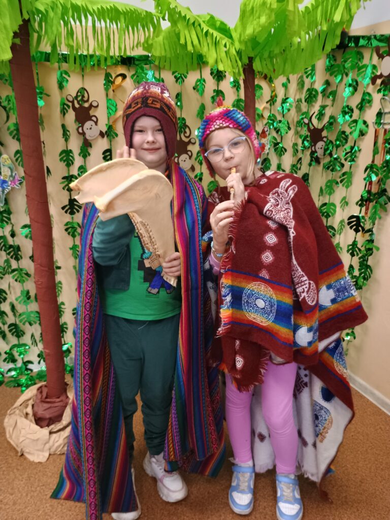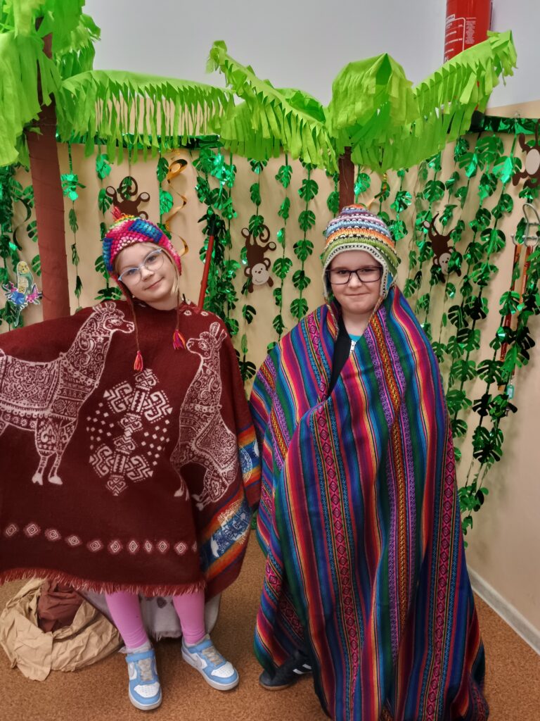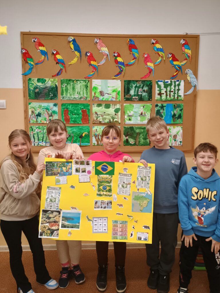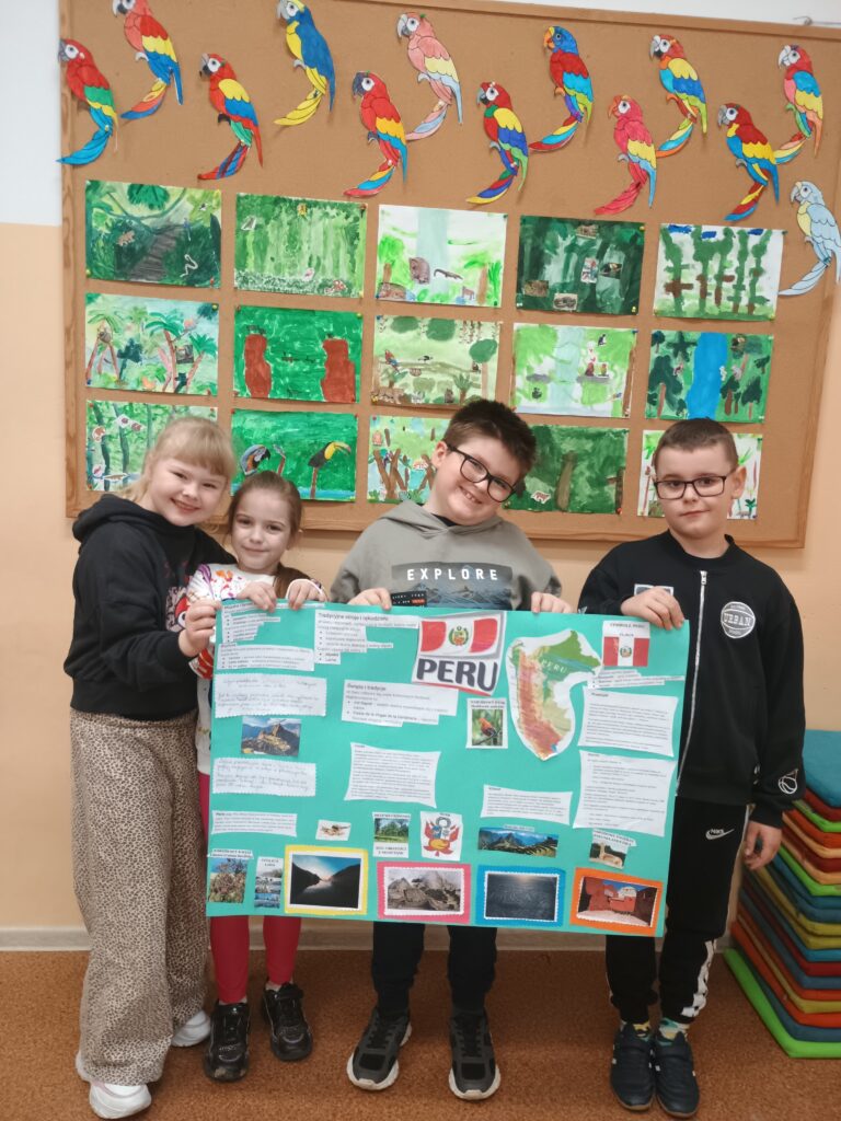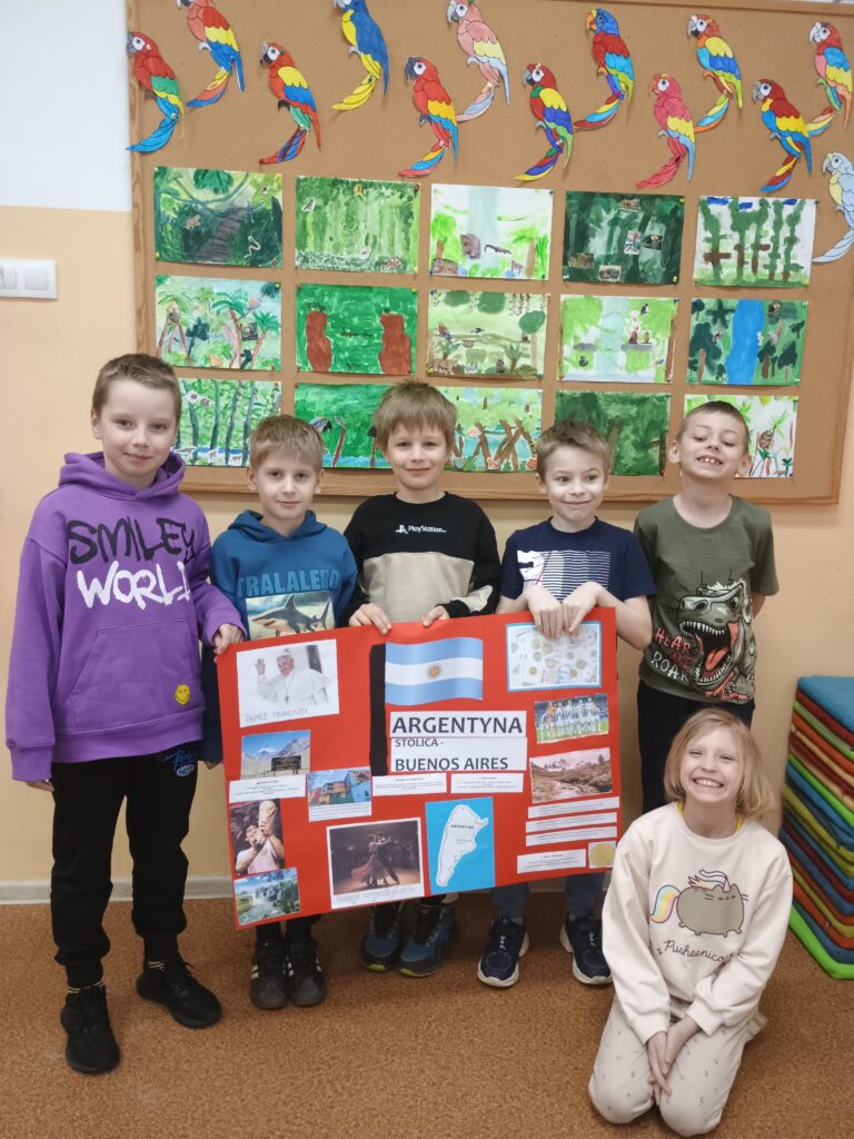 W marcu uczniowie klasy 2 realizowali projekt Klub 7 kontynentów. Tym razem przenieśliśmy się do Ameryki Południowej. Poznaliśmy niektóre państwa, ich stolice i flagi, zwierzęta i roślinność z różnych regionów, najwyższe góry, rzekę, miasto i wodospad. Oglądaliśmy krajobrazy z pięciu stref klimatycznych jakie tam występują. Uczyliśmy się pracować z mapą. Poznaliśmy też historię Inków i oglądaliśmy prezentację o zabytkach i osobliwościach Ameryki Południowej. Udało mi się również zaprosić panią Magdalenę Rossinelli, która mieszkała m.in. w Peru, aby opowiedziała nam o życiu na tym niezwykłym kontynencie. W kolejnym tygodniu podczas wycieczki do Poznania obejrzeliśmy okazy zwierząt pochodzących z Ameryki Południowej. Na zakończenie projektu dostaliśmy breloczki- kapibary.