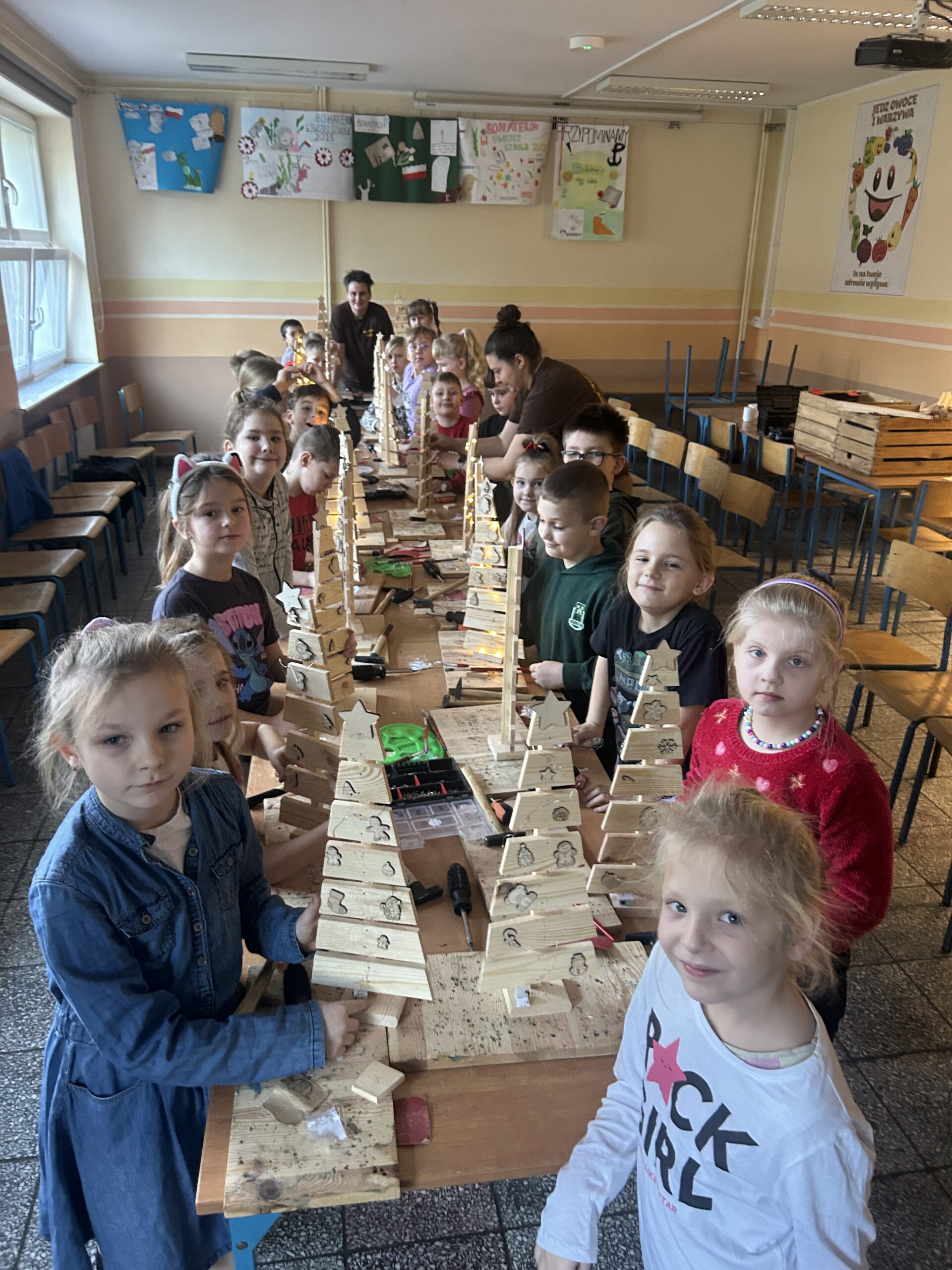 W szkole do świąt przygotowywaliśmy się już od początku grudnia. Przypomnieliśmy zwyczaje i tradycje bożonarodzeniowe, śpiewaliśmy kolędy i piosenki o Mikołaju, wykonaliśmy prace plastyczne. W klasie stanęła piękna pachnąca choinka zorganizowana przez rodziców, którą dzieci wspólnie dekorowały zrobionymi przez siebie łańcuchami i zawieszkami. Zrobiliśmy również skarpety mikołajowe, udekorowaliśmy naszą salę, skonstruowaliśmy drewniane choinki na warsztatach stolarskich, upiekliśmy i dekorowaliśmy pierniczki oraz codziennie staraliśmy się wykonać zadania z klasowego kalendarza adwentowego. Klasa 1 wraz z klasa 2 wystąpiła również na Mikołajkach Gminnych w Ryczywole śpiewając piosenki i kolędy.