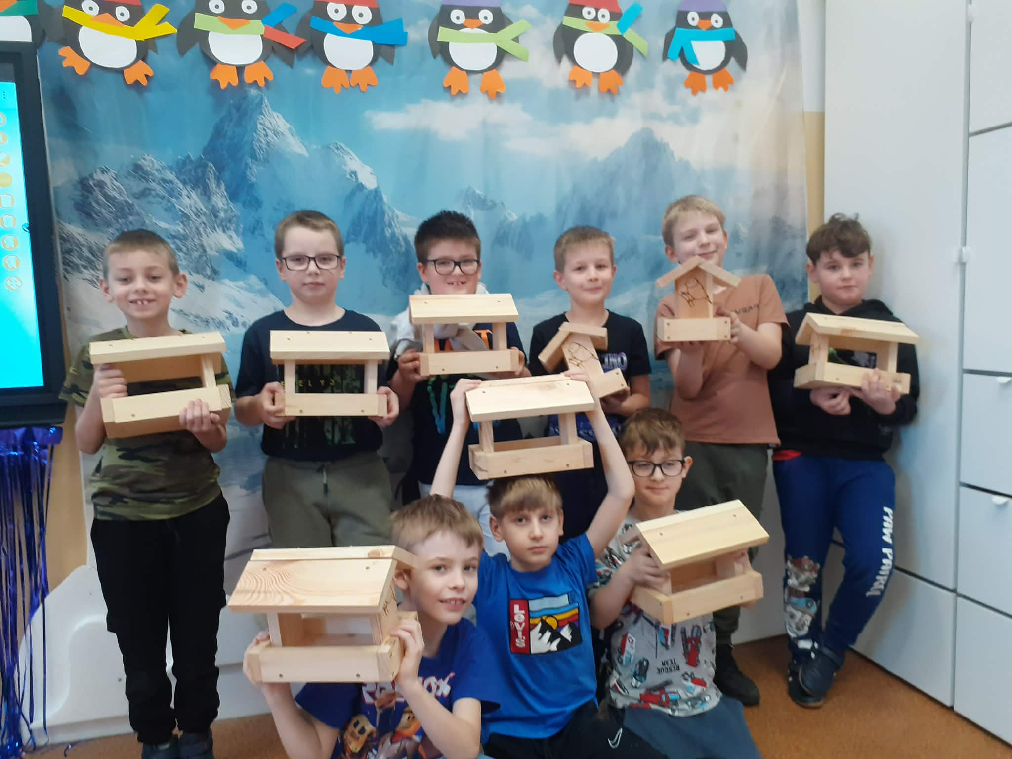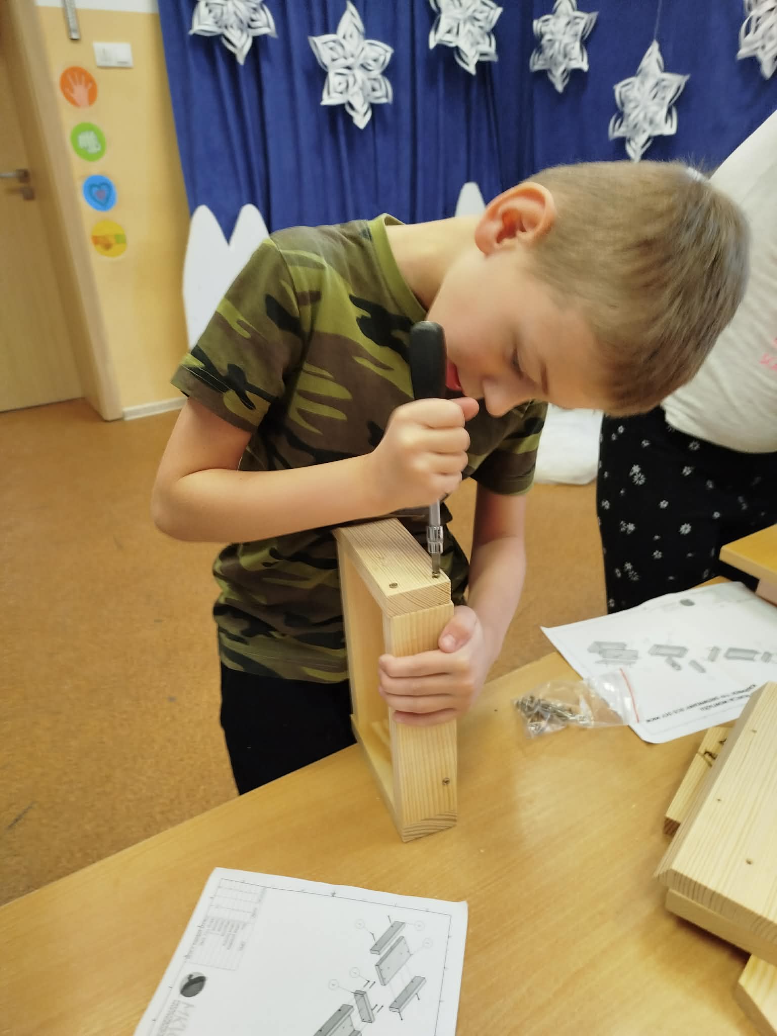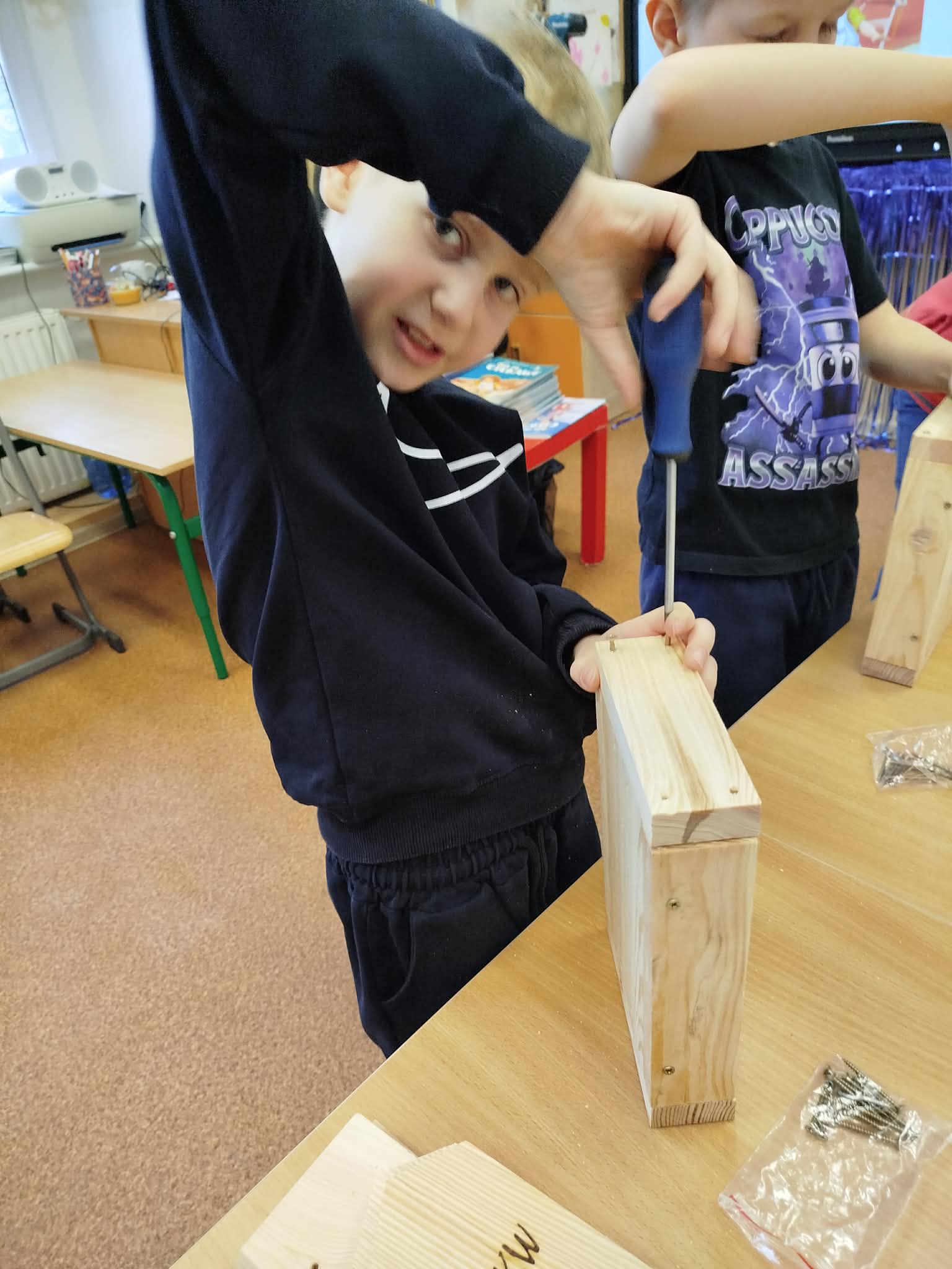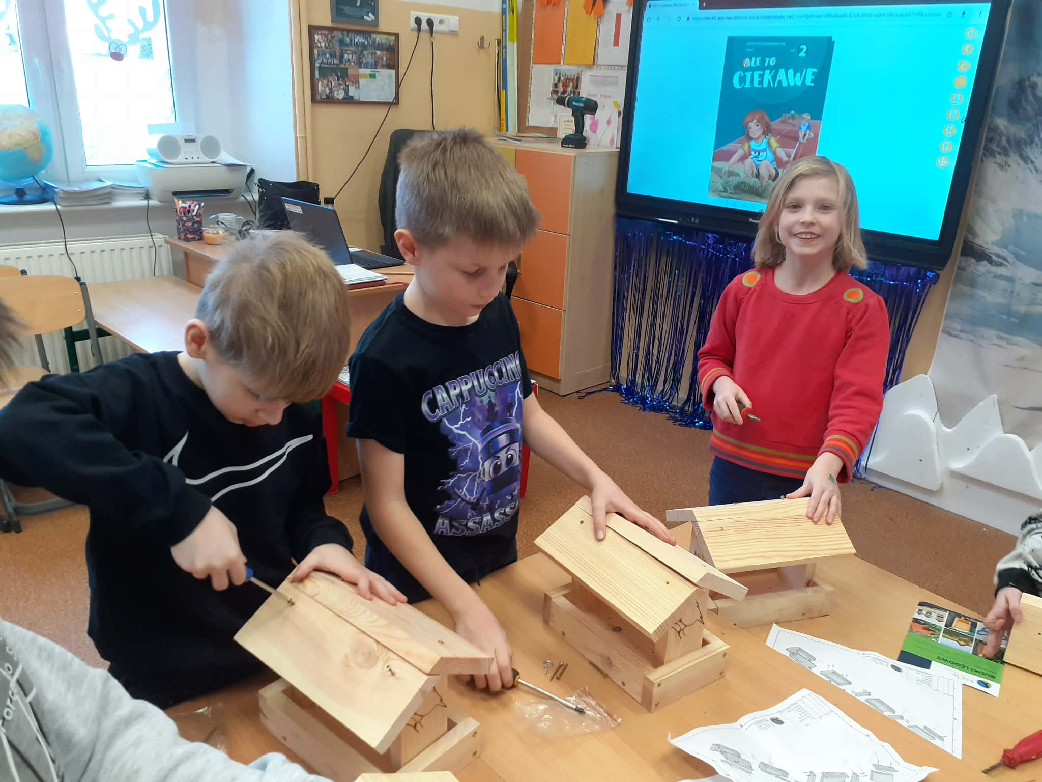 W związku z omawianym działem lekcyjnym o dokarmianiu ptaków, uczniowie klasy 2 wykonali karmniki dla ptaków. Tym razem dzieci uczyły się łączenia drewna za pomocą śrubokrętu i wkrętów. Ćwiczyły nie tylko sprawność manualną, ale również umiejętność wykonywania czynności wg instrukcji. Gotowe karmniki dzieci zabrały do domu. Teraz ptaszki będą miały nowe stołówki 🙂