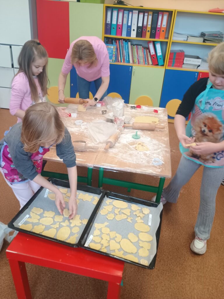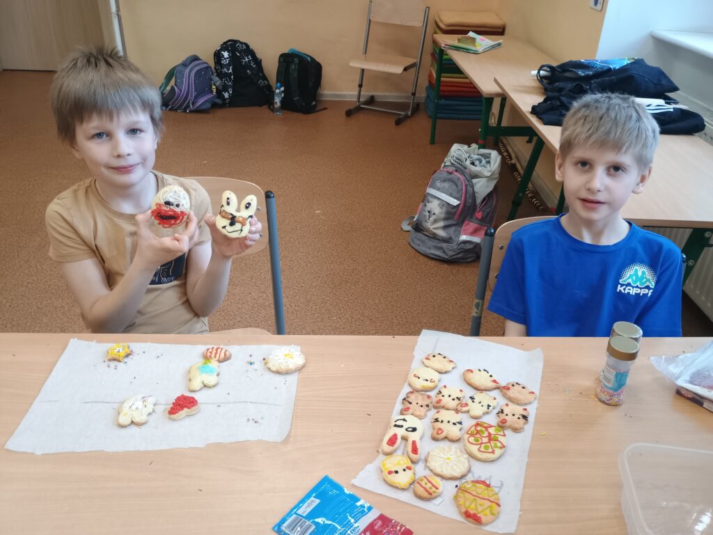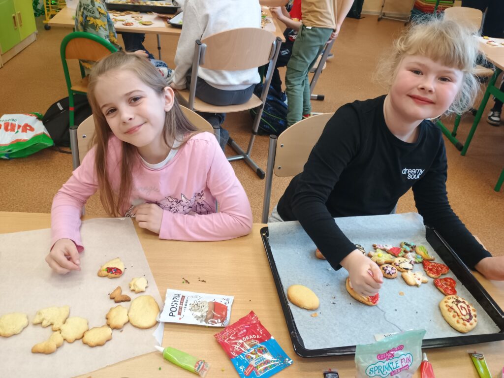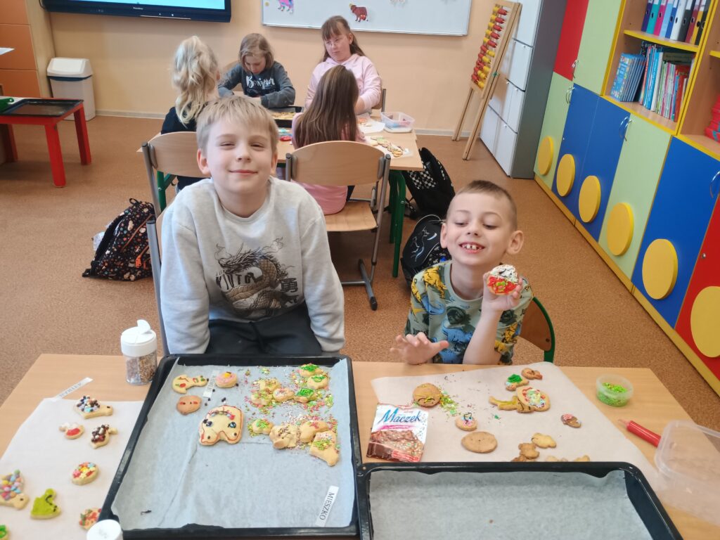 Na kolejnych warsztatach kulinarnych uczniowie klasy 2 piekli wielkanocne ciasteczka, które po upieczeniu dekorowali kolorowym lukrem i posypkami. Dzieci wykazały się dużą pomysłowością i precyzją. Powstały małe dzieła sztuki cukierniczej. Ciekawe kto w przyszłości zostanie cukiernikiem:)