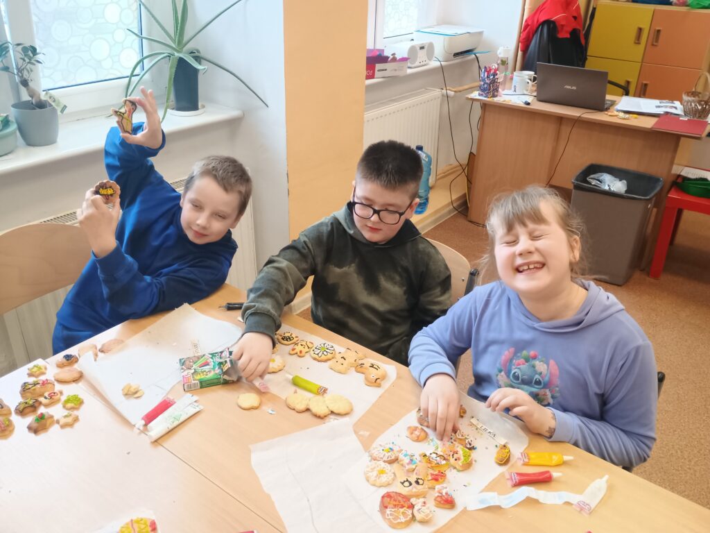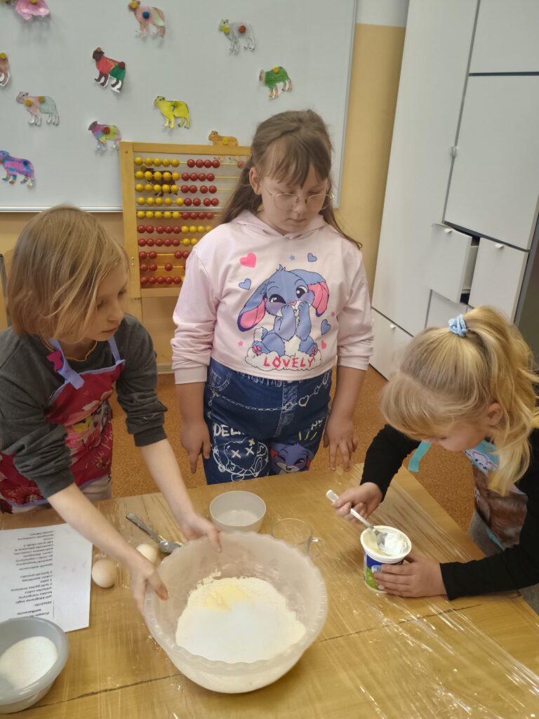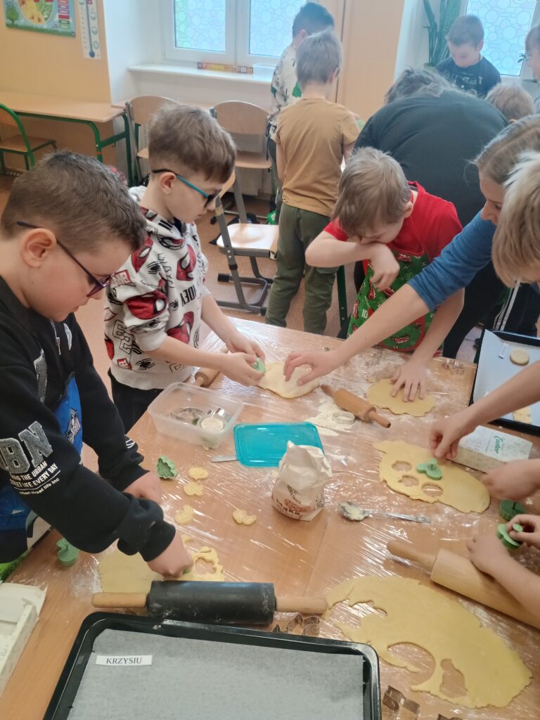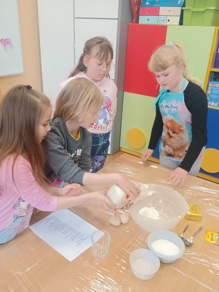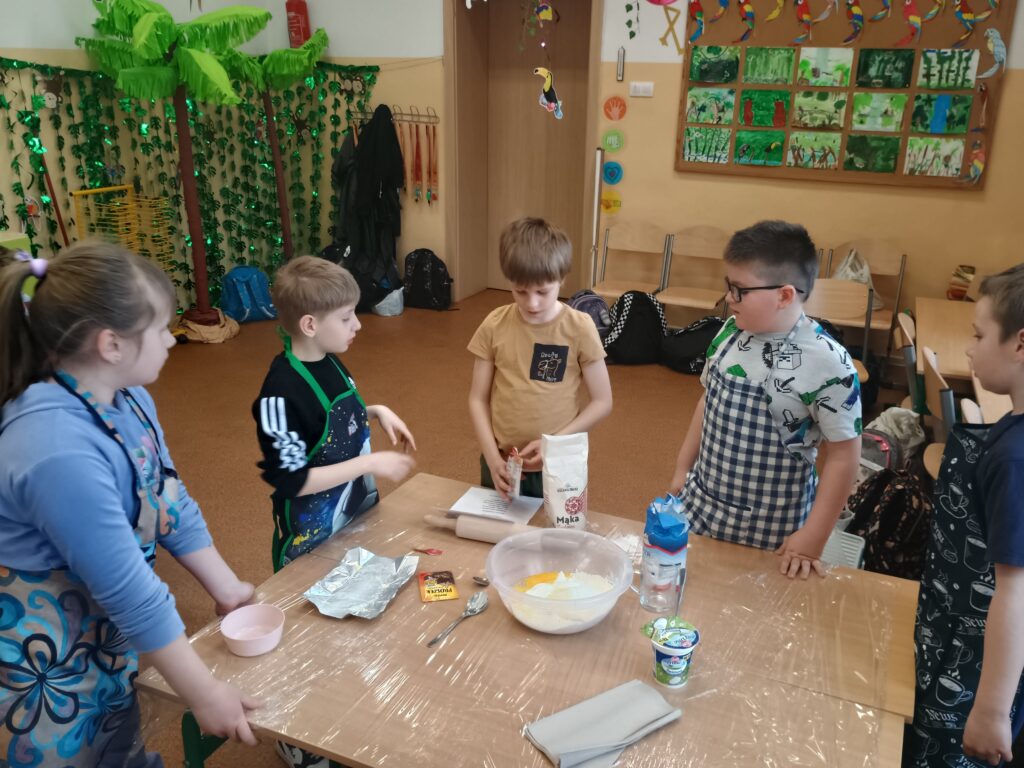 Na kolejnych warsztatach kulinarnych uczniowie klasy 2 piekli wielkanocne ciasteczka, które po upieczeniu dekorowali kolorowym lukrem i posypkami. Dzieci wykazały się dużą pomysłowością i precyzją. Powstały małe dzieła sztuki cukierniczej. Ciekawe kto w przyszłości zostanie cukiernikiem:)