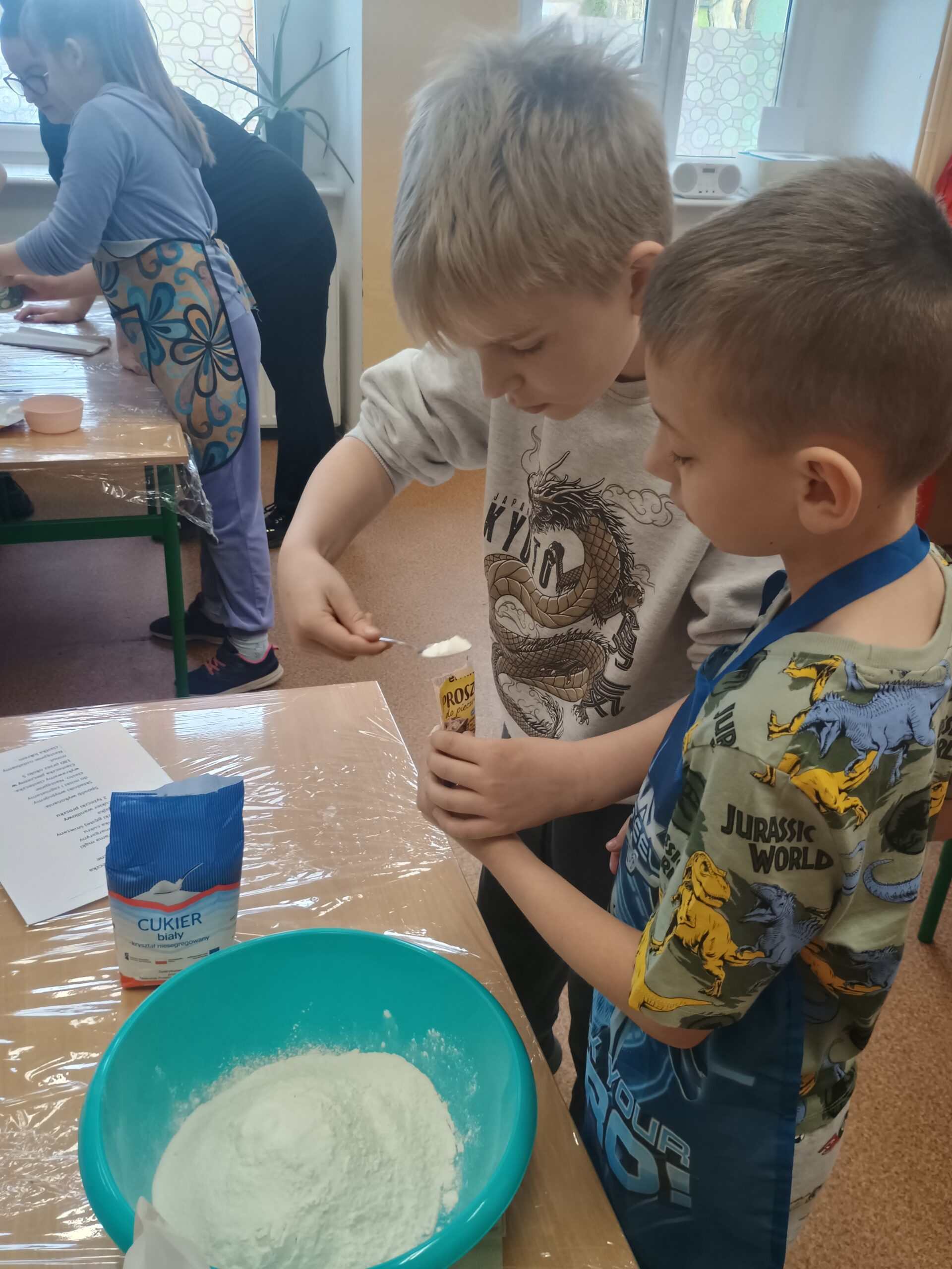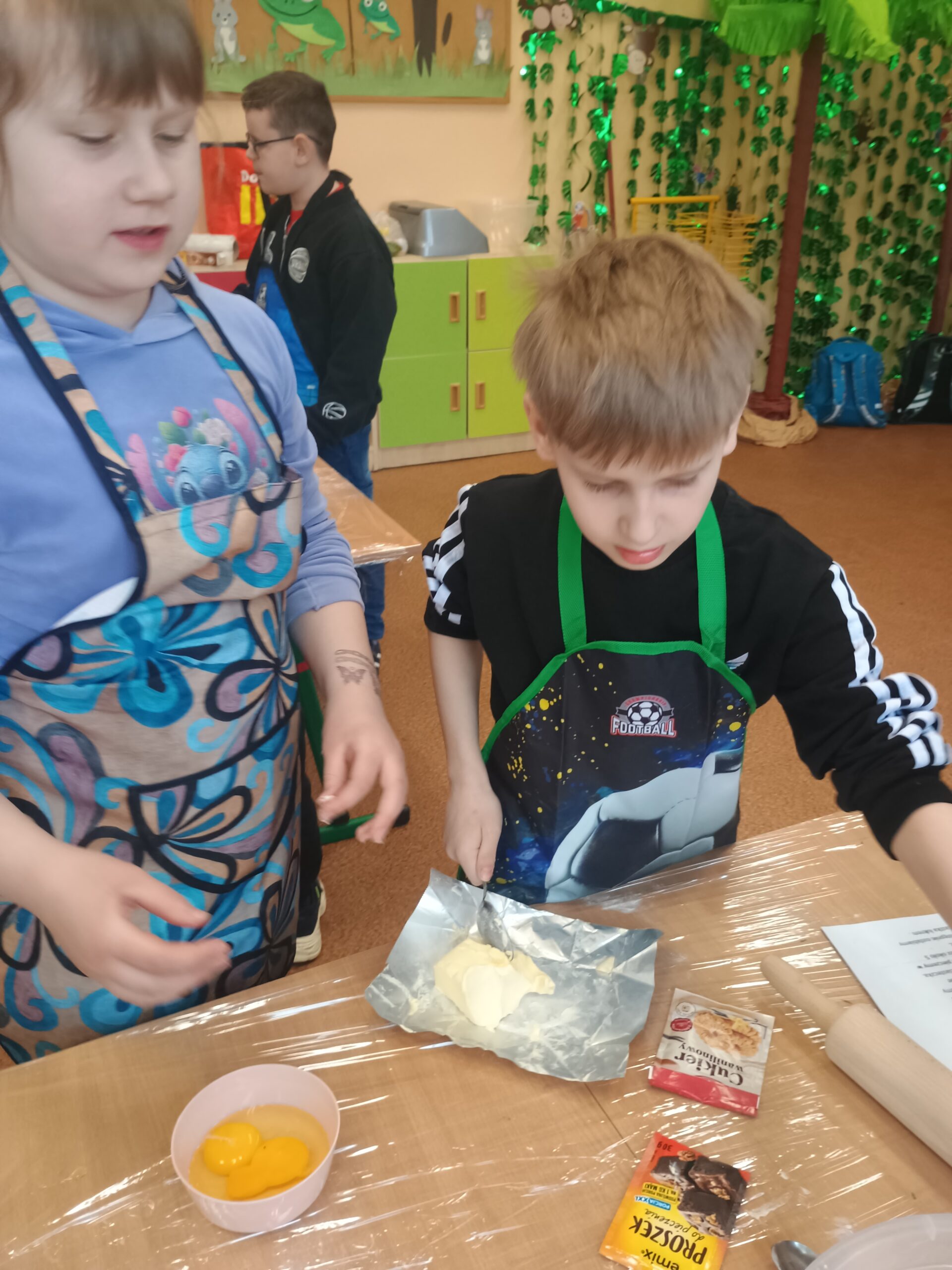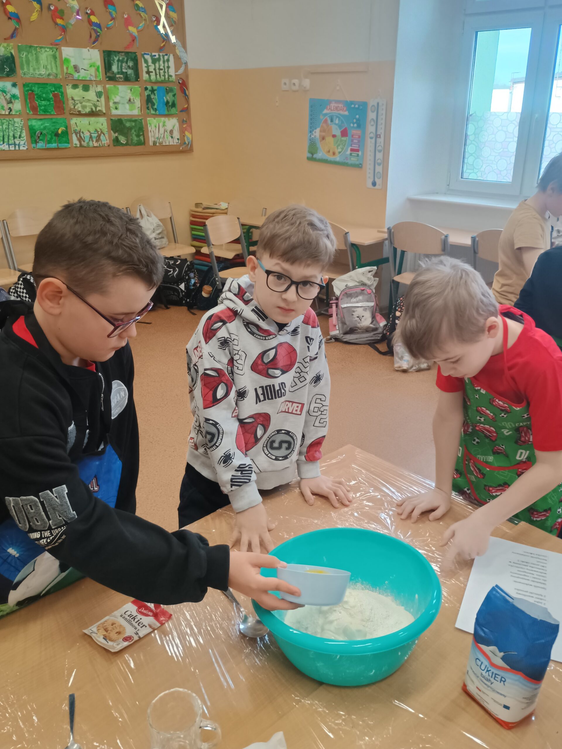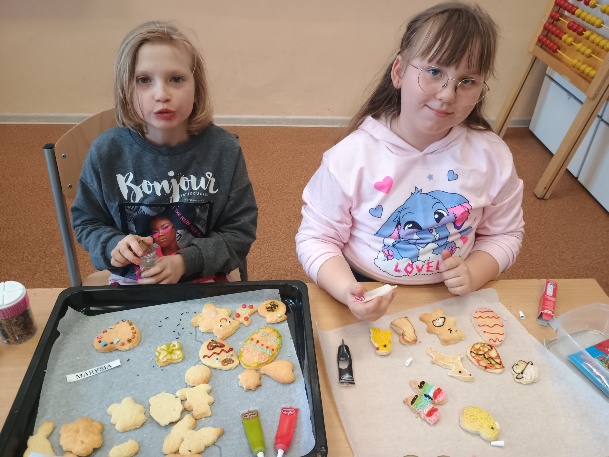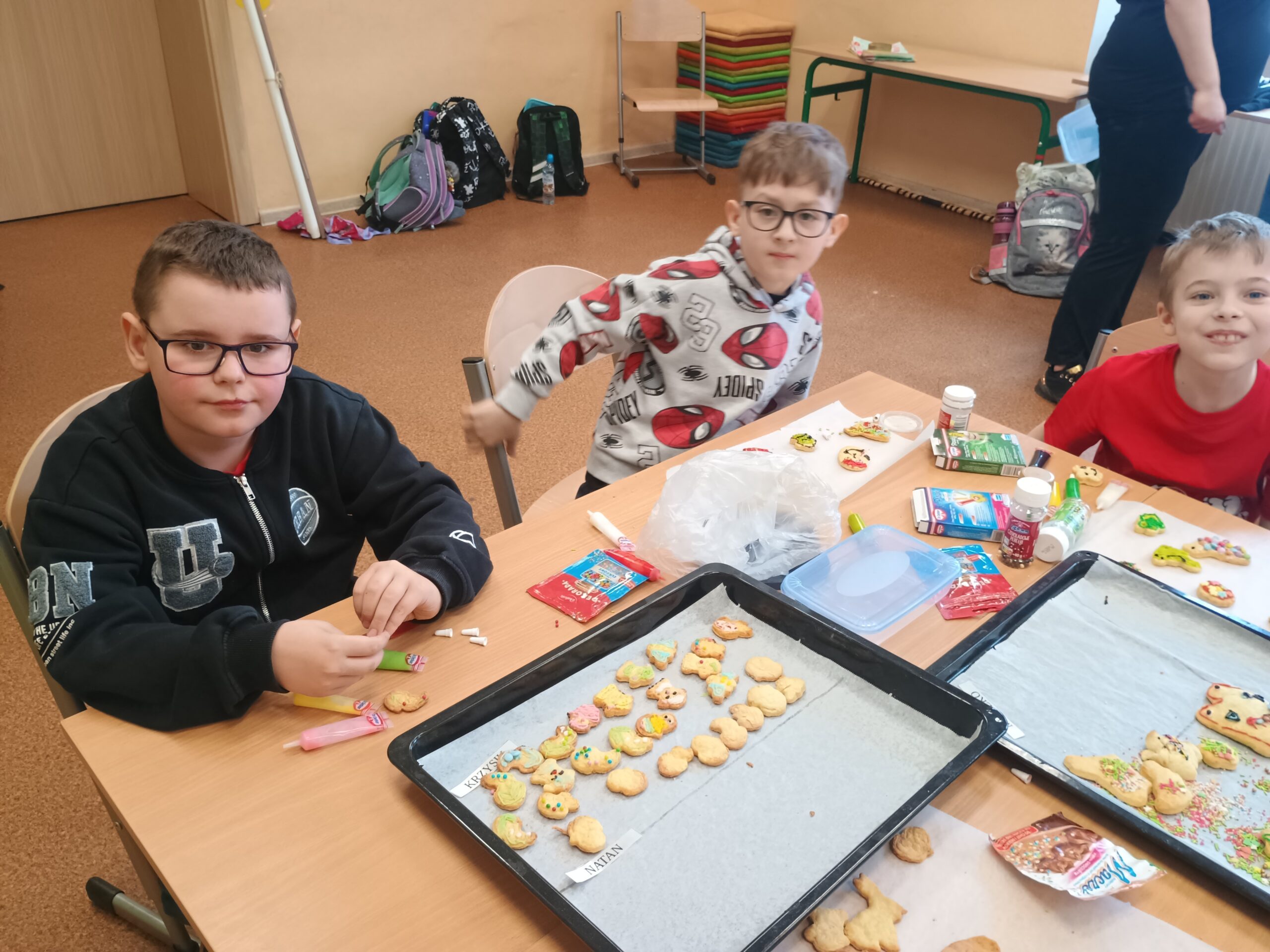 Na kolejnych warsztatach kulinarnych uczniowie klasy 2 piekli wielkanocne ciasteczka, które po upieczeniu dekorowali kolorowym lukrem i posypkami. Dzieci wykazały się dużą pomysłowością i precyzją. Powstały małe dzieła sztuki cukierniczej. Ciekawe kto w przyszłości zostanie cukiernikiem:)