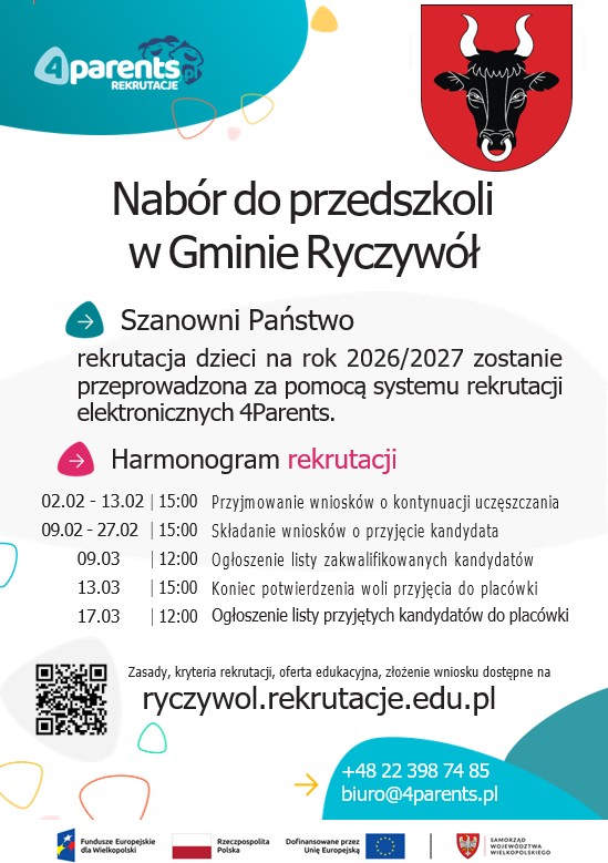 Zgodnie z harmonogramem czynności w postępowaniu rekrutacyjnym na rok szkolny 2026/2027 ustalonym w Zarządzeniu Nr 7/2026 Wójta Gminy Ryczywół, odbywać się będzie rekrutacja do przedszkola, która zostanie przeprowadzona wyłącznie za pomocą systemu rekrutacji elektronicznych 4Parents. Warunkiem niezbędnym do prawidłowego przejścia procesu rekrutacji jest posiadanie profilu zaufanego przez obojga rodziców/opiekunów prawnych dziecka. Brak profilu zaufanego uniemożliwi złożenie i podpisanie deklaracji o kontynuowaniu wychowania przedszkolnego oraz wniosku o przyjęcie dziecka do przedszkola na kolejny rok szkolny.